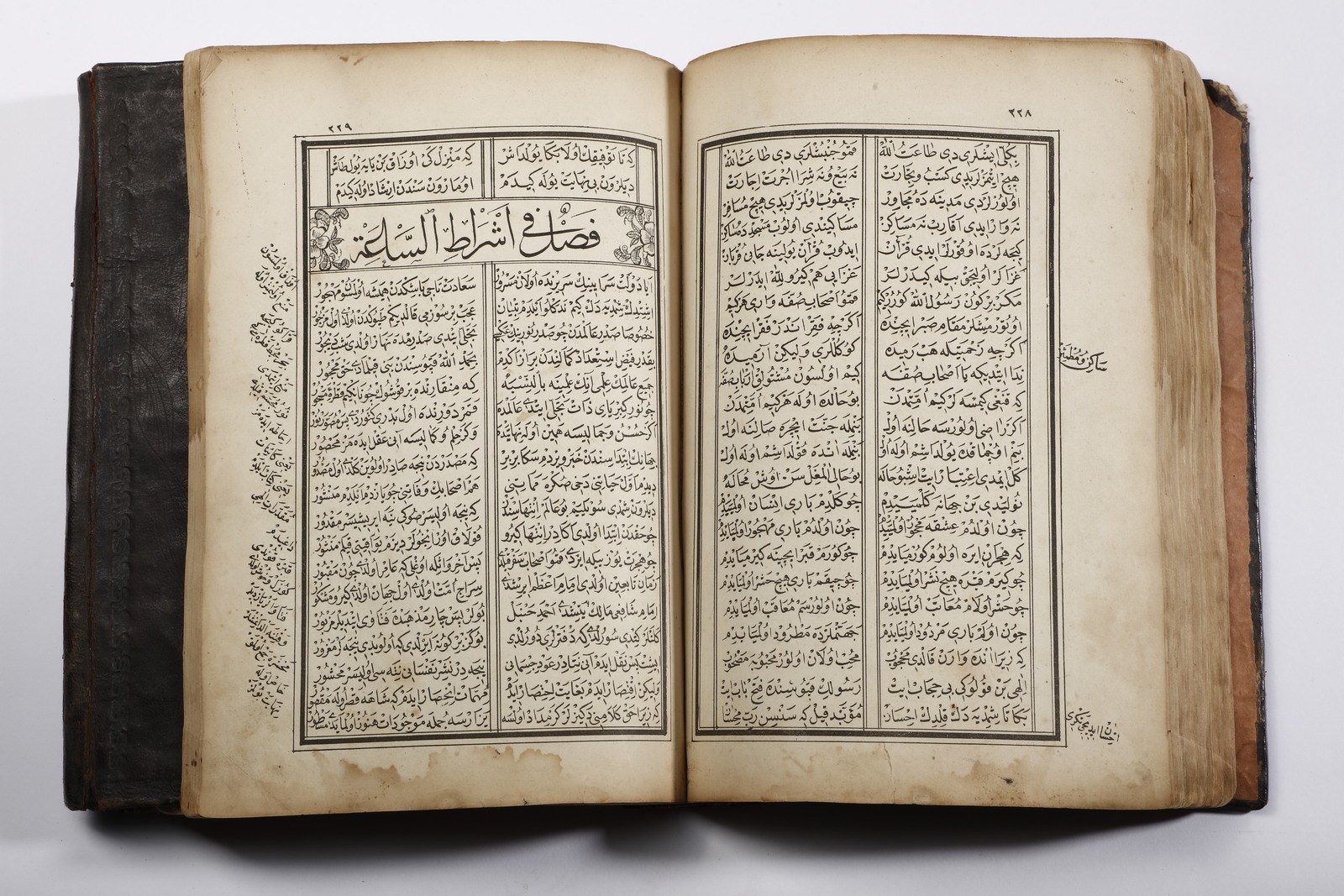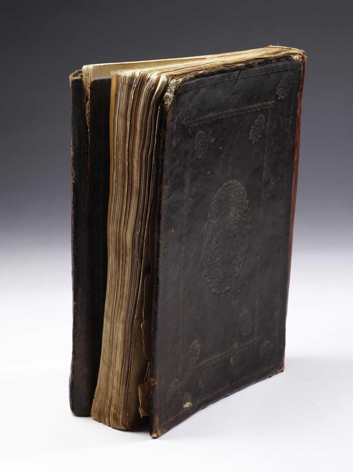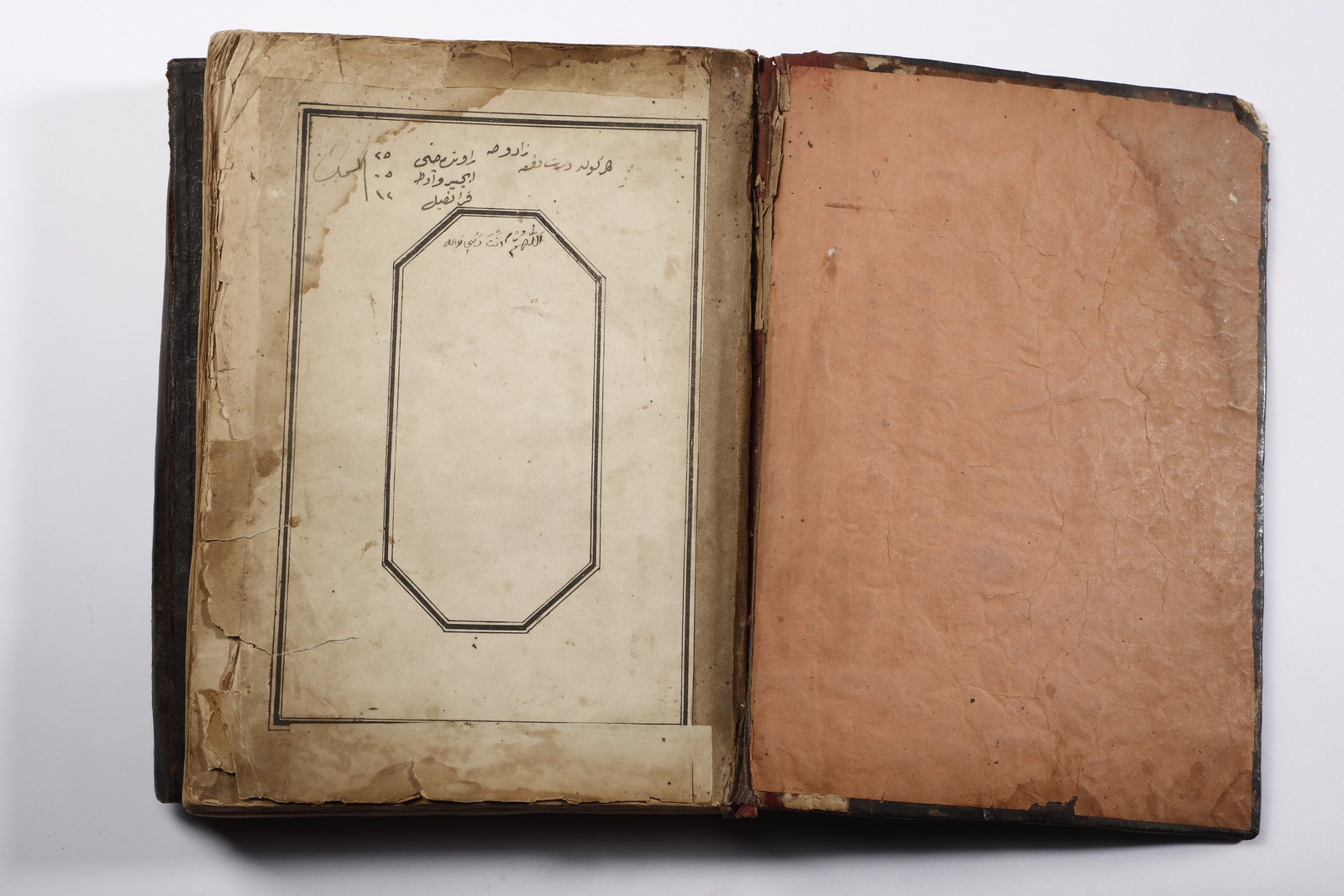 XX secolo . . Cm 20,00 x 26,50 x 4,40. Testo devozionale in arabo su carta entro rilegatura ricoperta in pelle bruna ed impressa con medaglione floreale centrale.