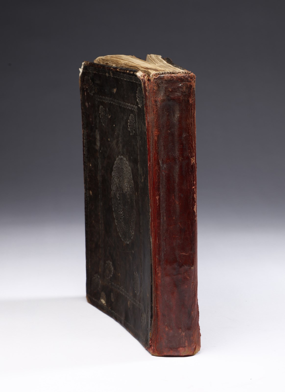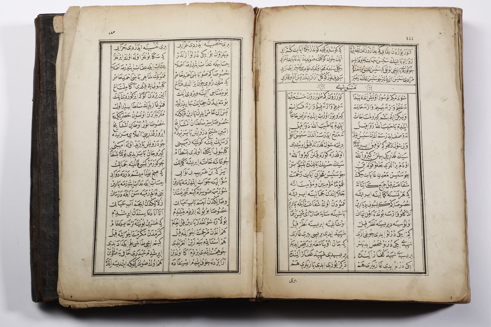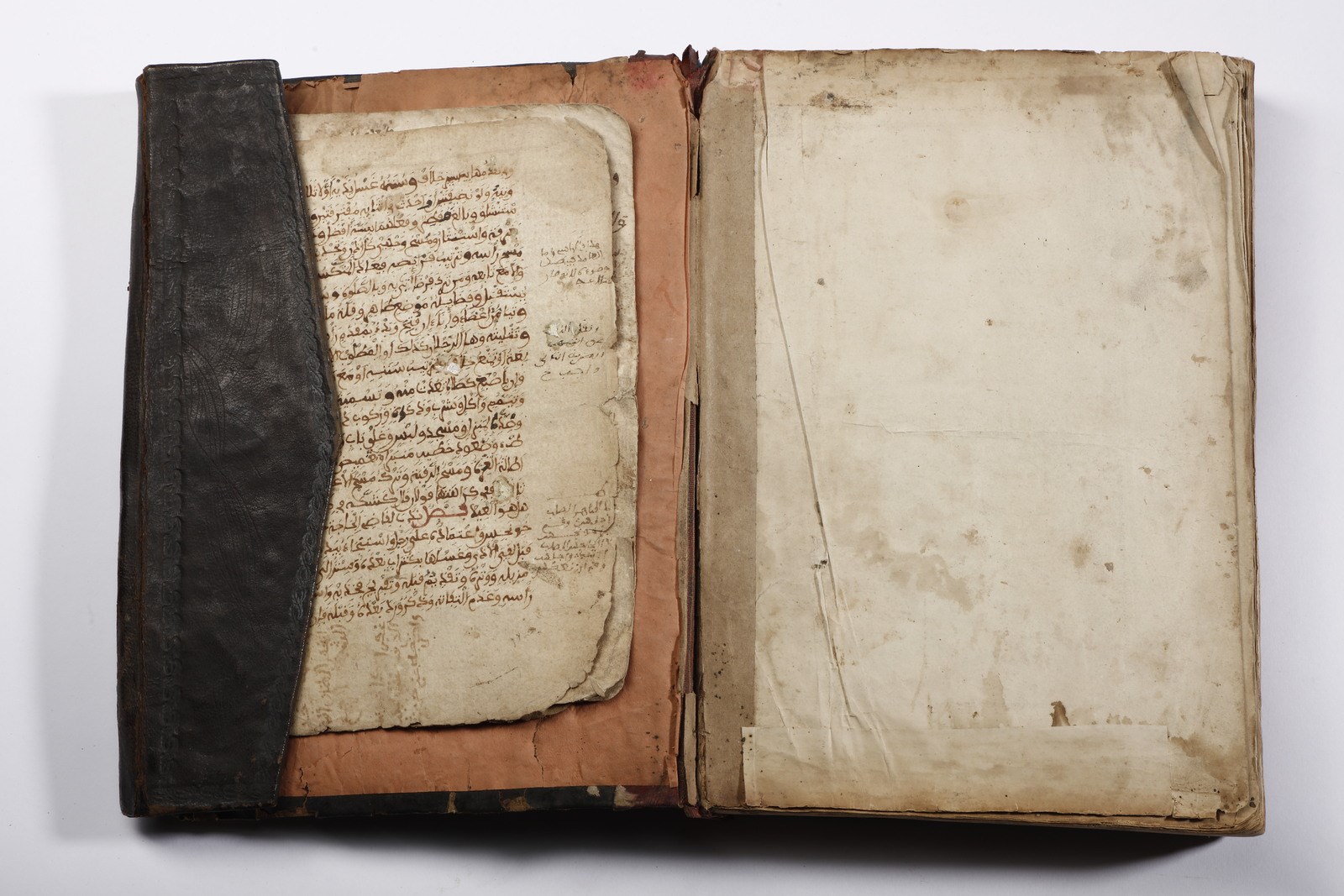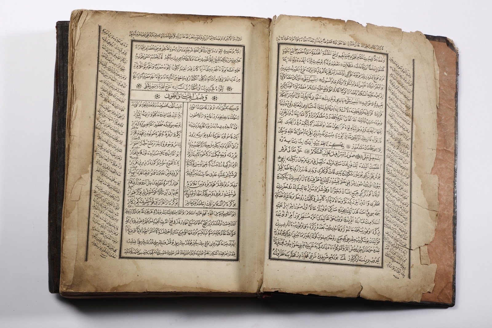 XX secolo . . Cm 20,00 x 26,50 x 4,40. Testo devozionale in arabo su carta entro rilegatura ricoperta in pelle bruna ed impressa con medaglione floreale centrale.