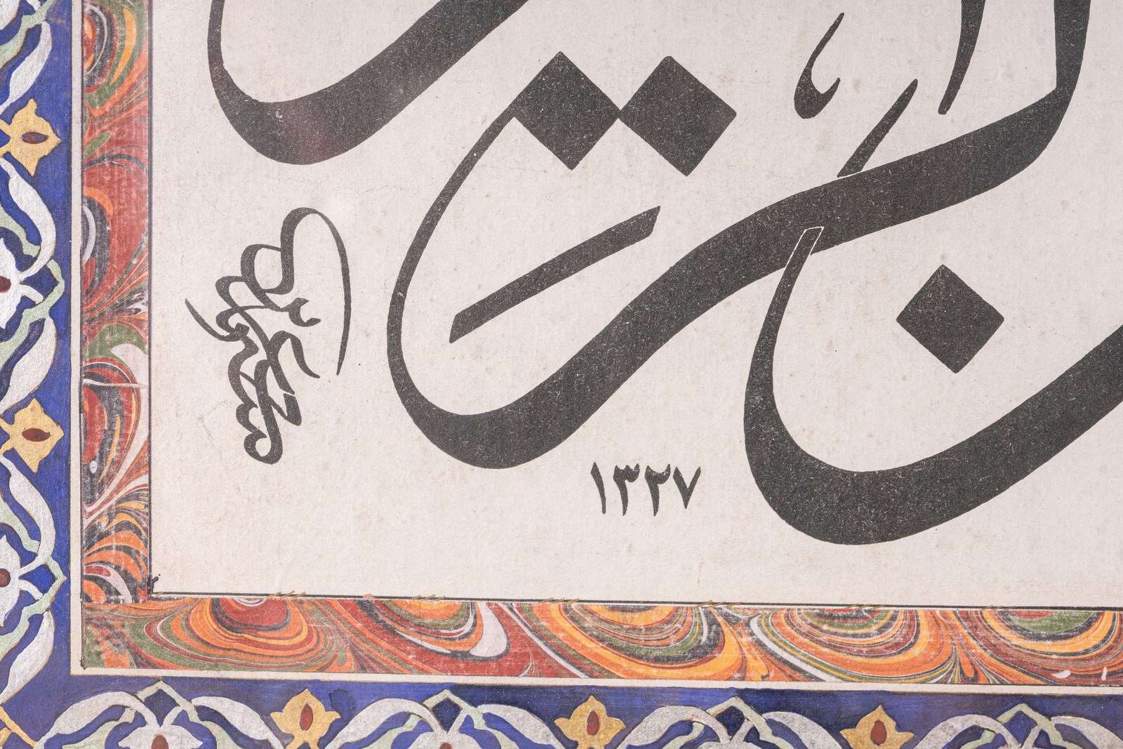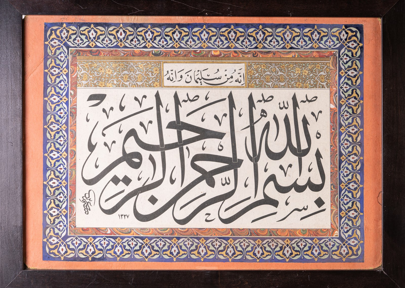 Arte Islamica Calligrafia religiosa firmata Omar Ebn Mahmud e datata 1327 AD (1909 AD). . Cm 69,00 x 48,00. Entro cornice con arabeschi variopinti intrecciati che ricordano le mattonelle cuerda seca timuridi ed un'altra cornice più sottile in carta marmorizzata. Testo in arabo su carta, scritto in ampio thuluth con inchiostro nero. Firma e data in basso a sinistra.