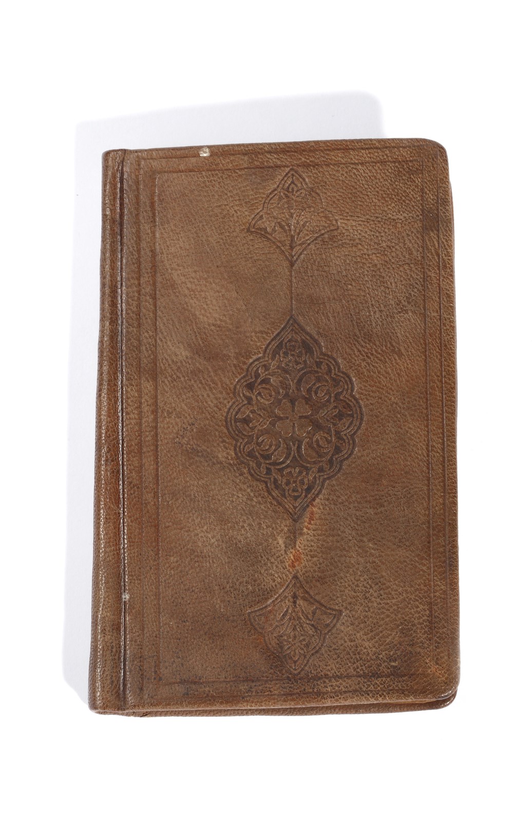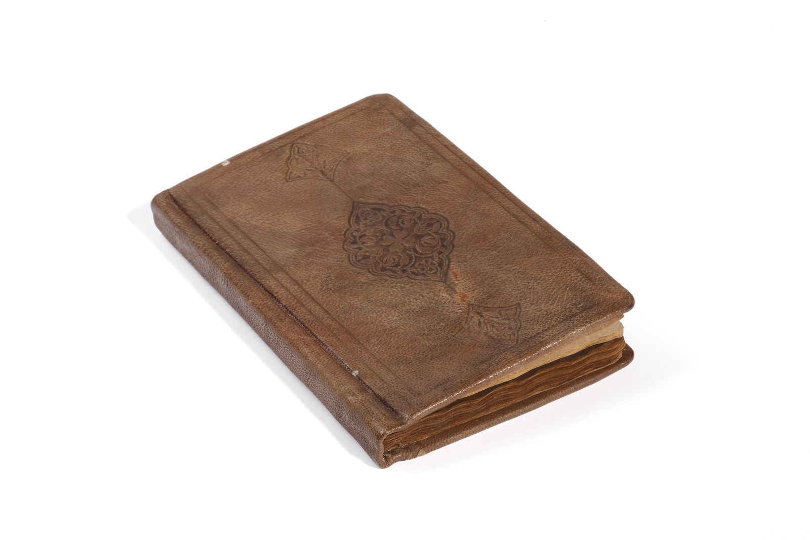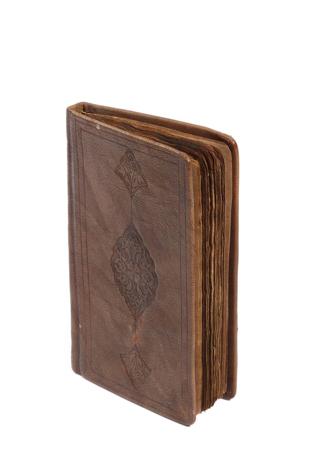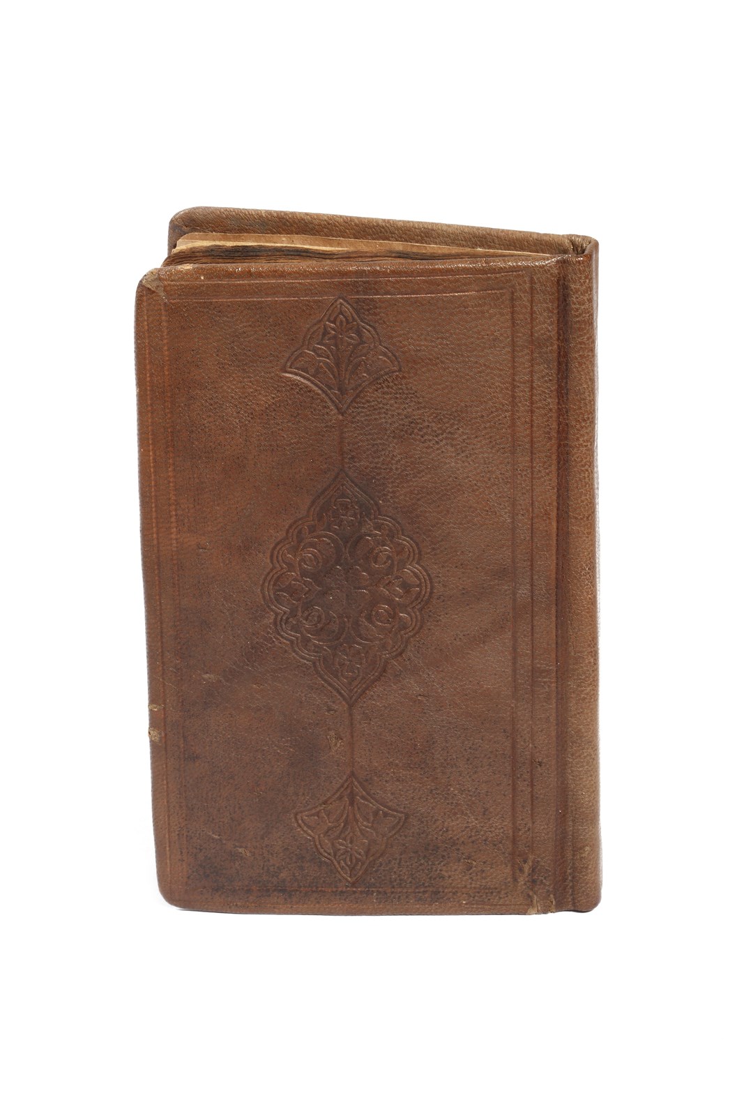 Assenti frontespizio e colophon. Copertina posteriore ricoperta in pelle marrone impressa.