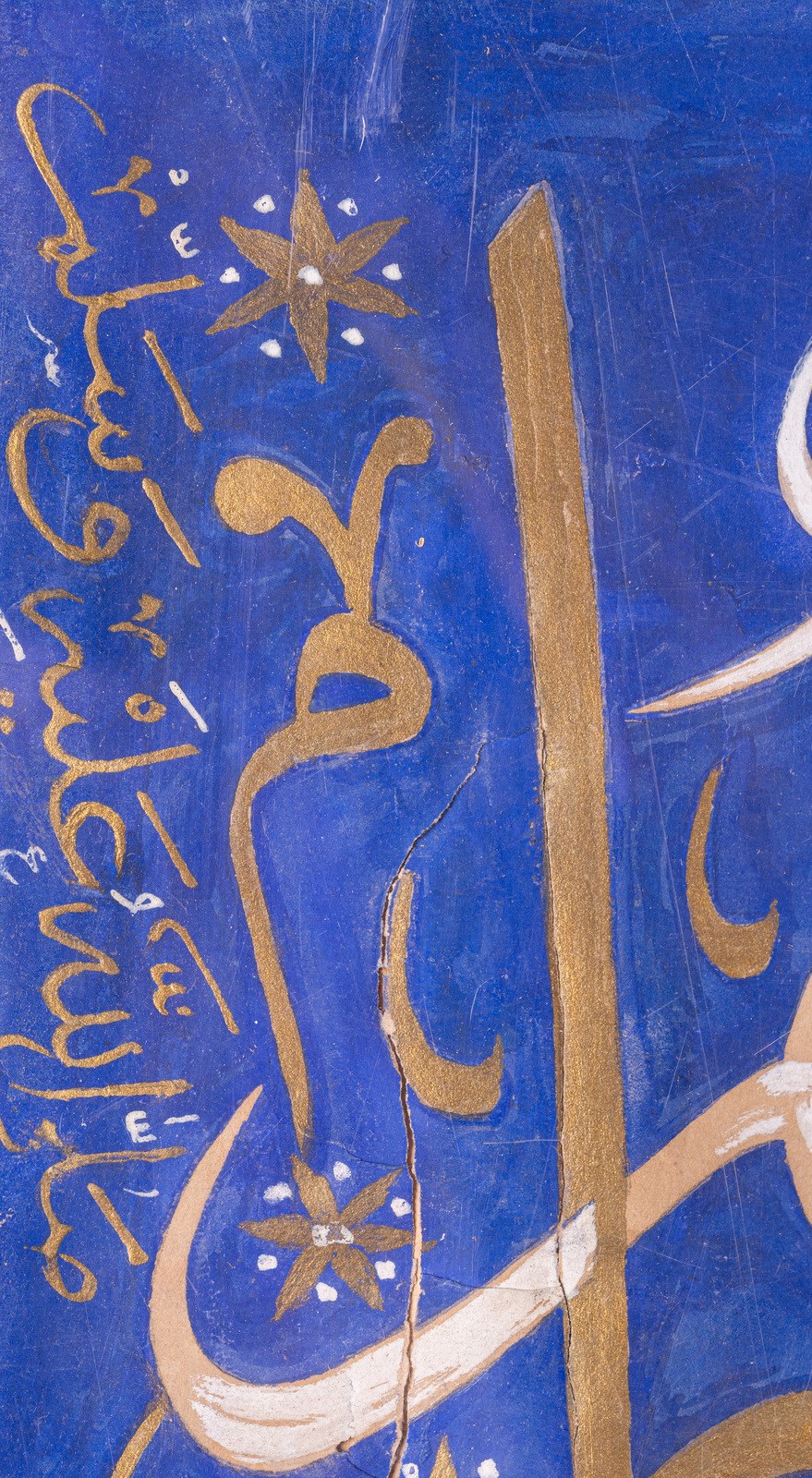 Arte Islamica Calligrafia religiosa su sfondo blu datata 1308 AH (1891 AD) e firmata Ahmad Ragheb