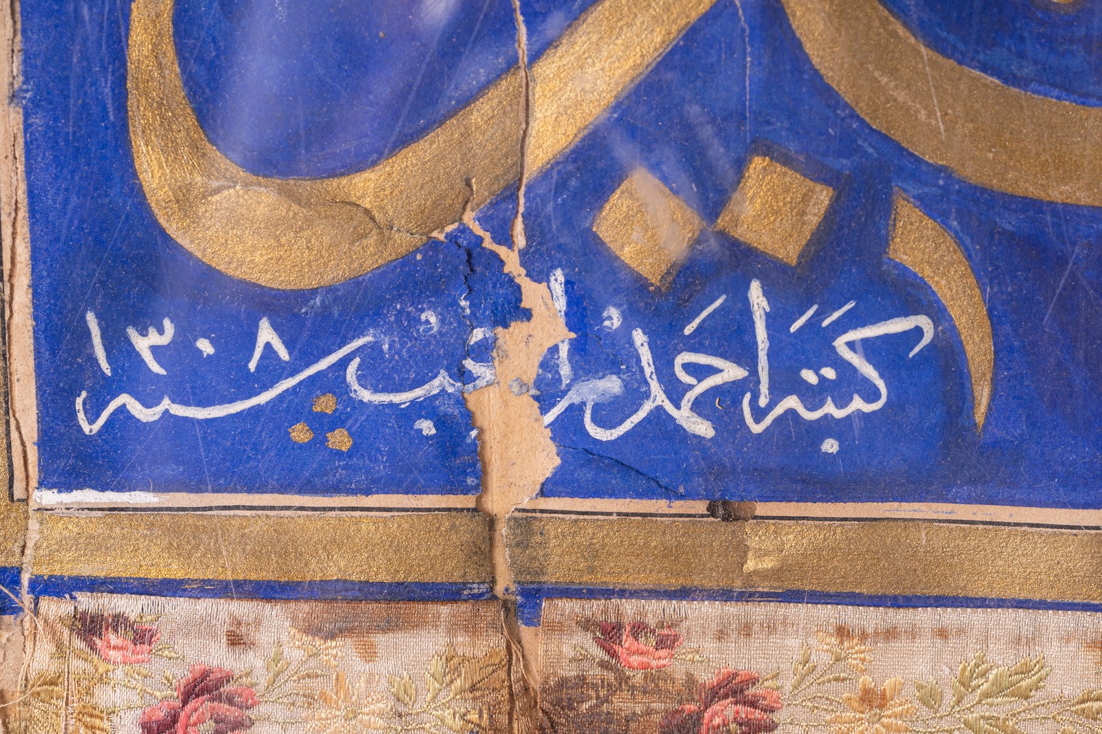 Arte Islamica - Calligrafia religiosa su sfondo blu datata 1308 AH (1891 AD) e firmata Ahmad Ragheb .