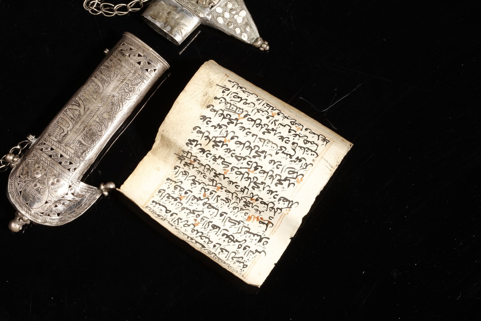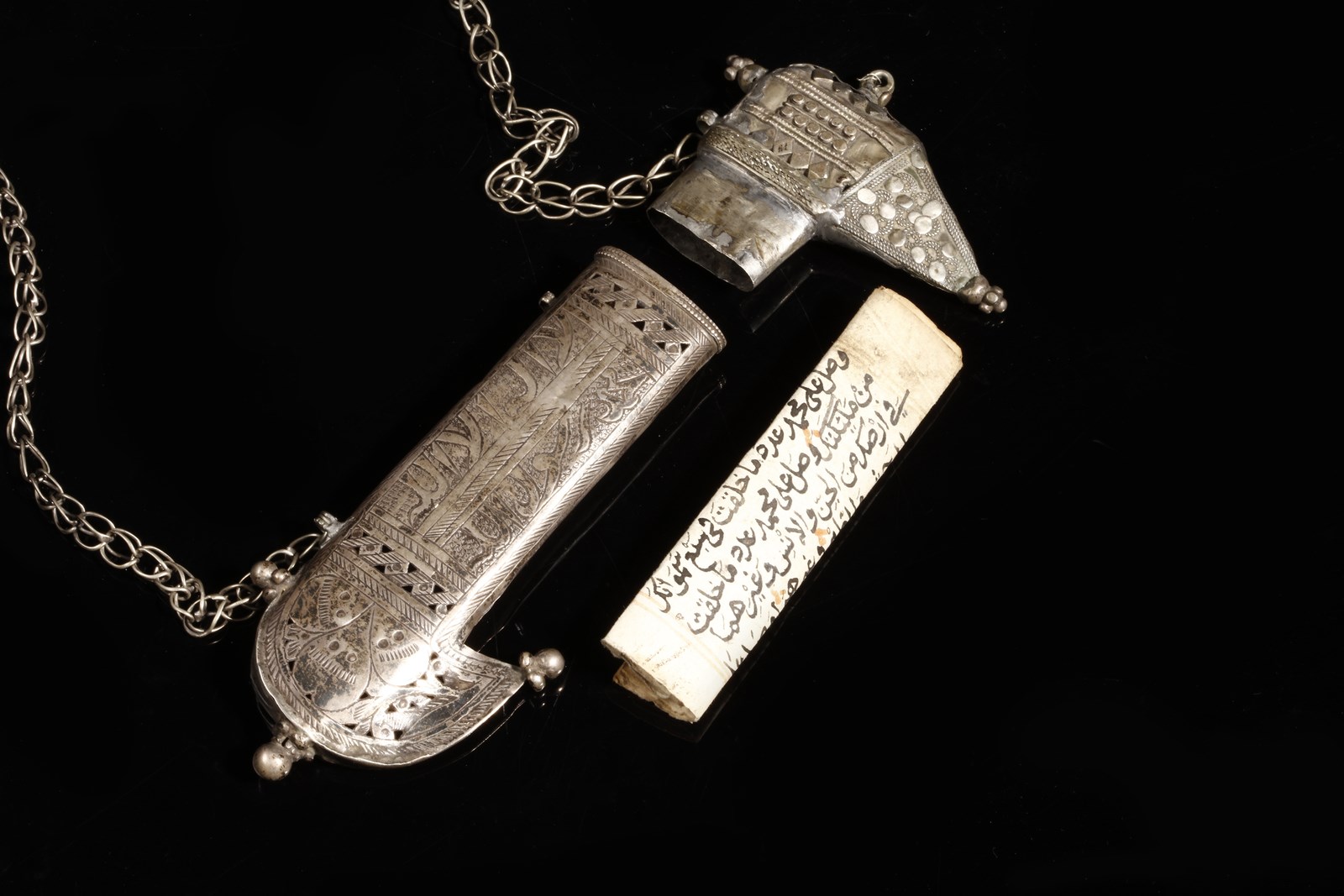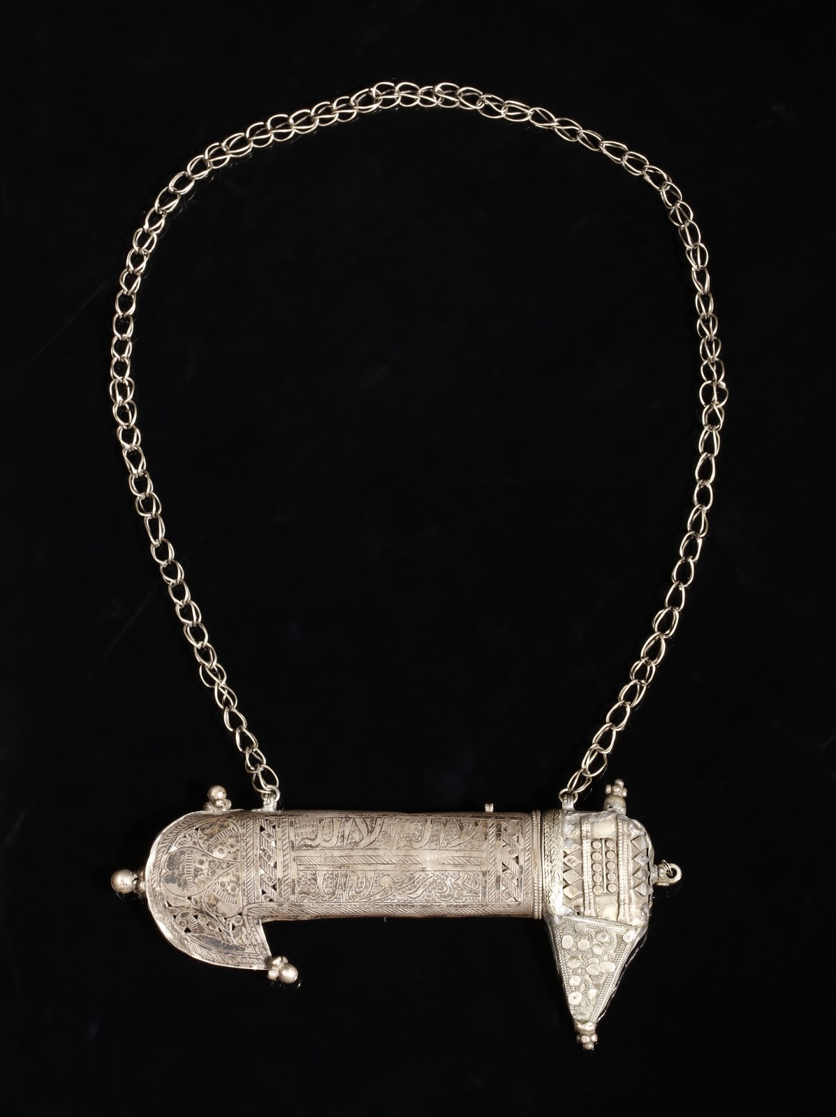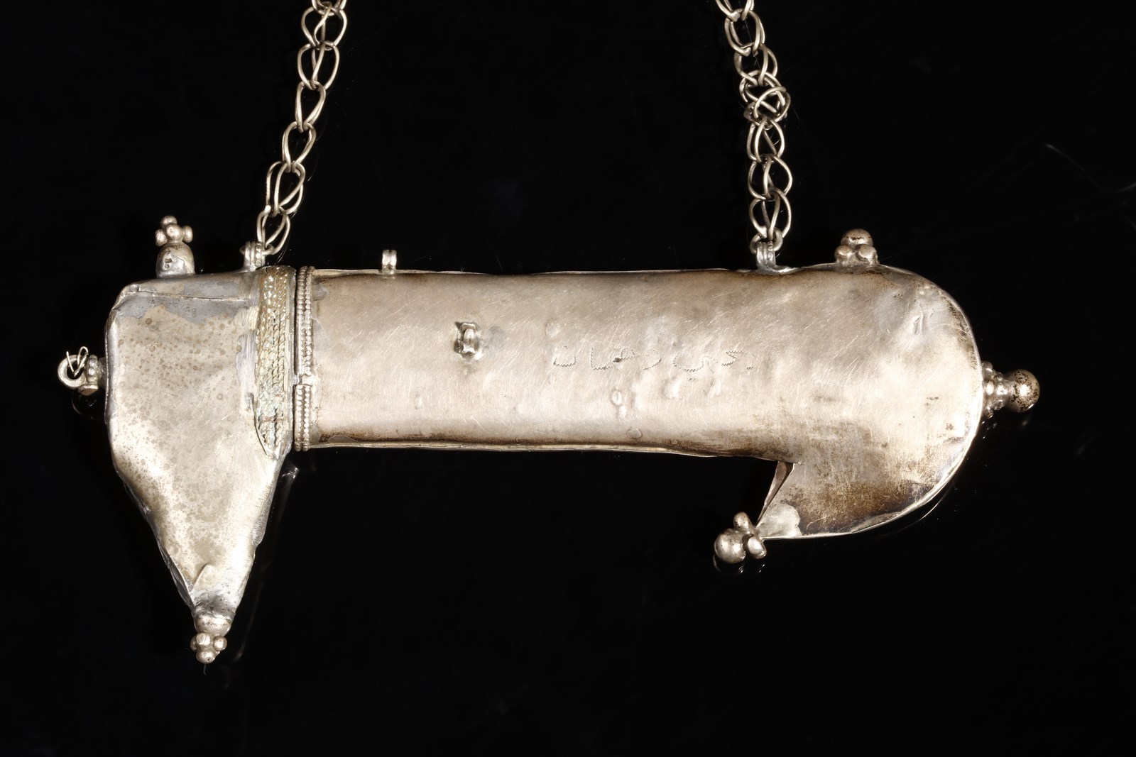 Yemen, inizio XX secolo . . Cm 19,00 x 9,50. Contenitore talismanico per preghiera, in forma di jambiya apribile, l'esterno inciso con iscrizioni e fiori stilizzati, catena di sospensione per il collo. All'interno è conservato un rotolo con iscrizioni religiose.