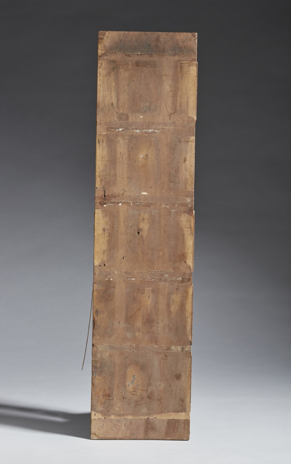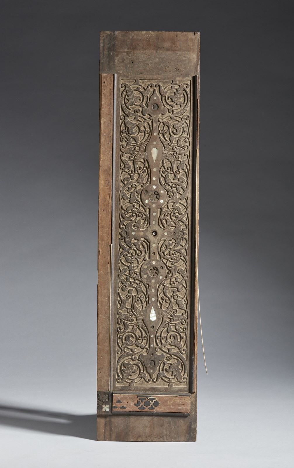 Spagna o Nord Africa, XVIII secolo (?). . Cm 71,50 x 17,00. Parte di rivestimento decorativo architettonico finemente intagliato con arabeschi fluttuanti intorno ad elementi cruciformi intarsiati con madreperla. La resa degli arabeschi è simile agli ataurique di epoca nasride, diffusi con piccole varianti anche nel Nord Africa, ma l'intarsio in madreperla sembra successivo.