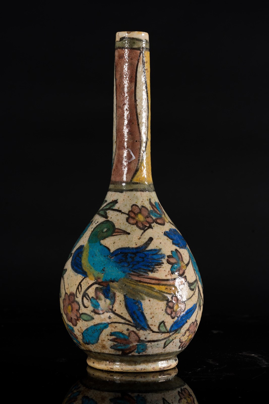 Arte Islamica Bottiglia in ceramica dipinta con fiori ed uccelli