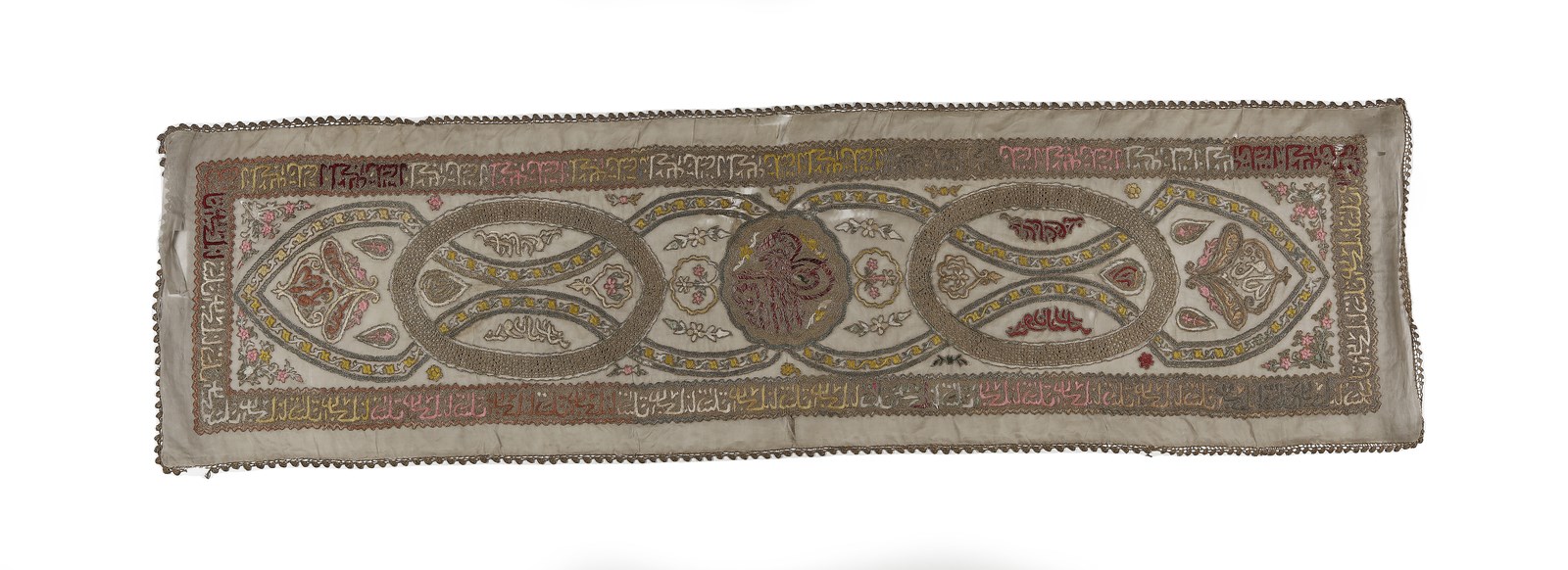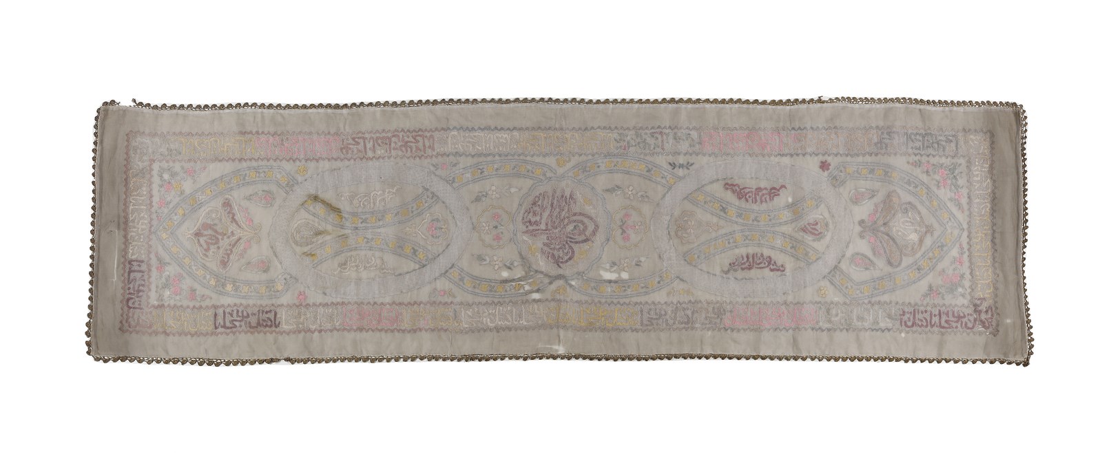 Turchia, inizio XX secolo . . Cm 49,00 x 179,00. Cotone ricamato con seta e filo metallico con medaglioni ogivali intrecciati contenenti decorazione floreale e lunga iscrizione, probabilmente di carattere religioso, lungo il bordo. Tughra sultaniale tipicamente ottomana nel centro.