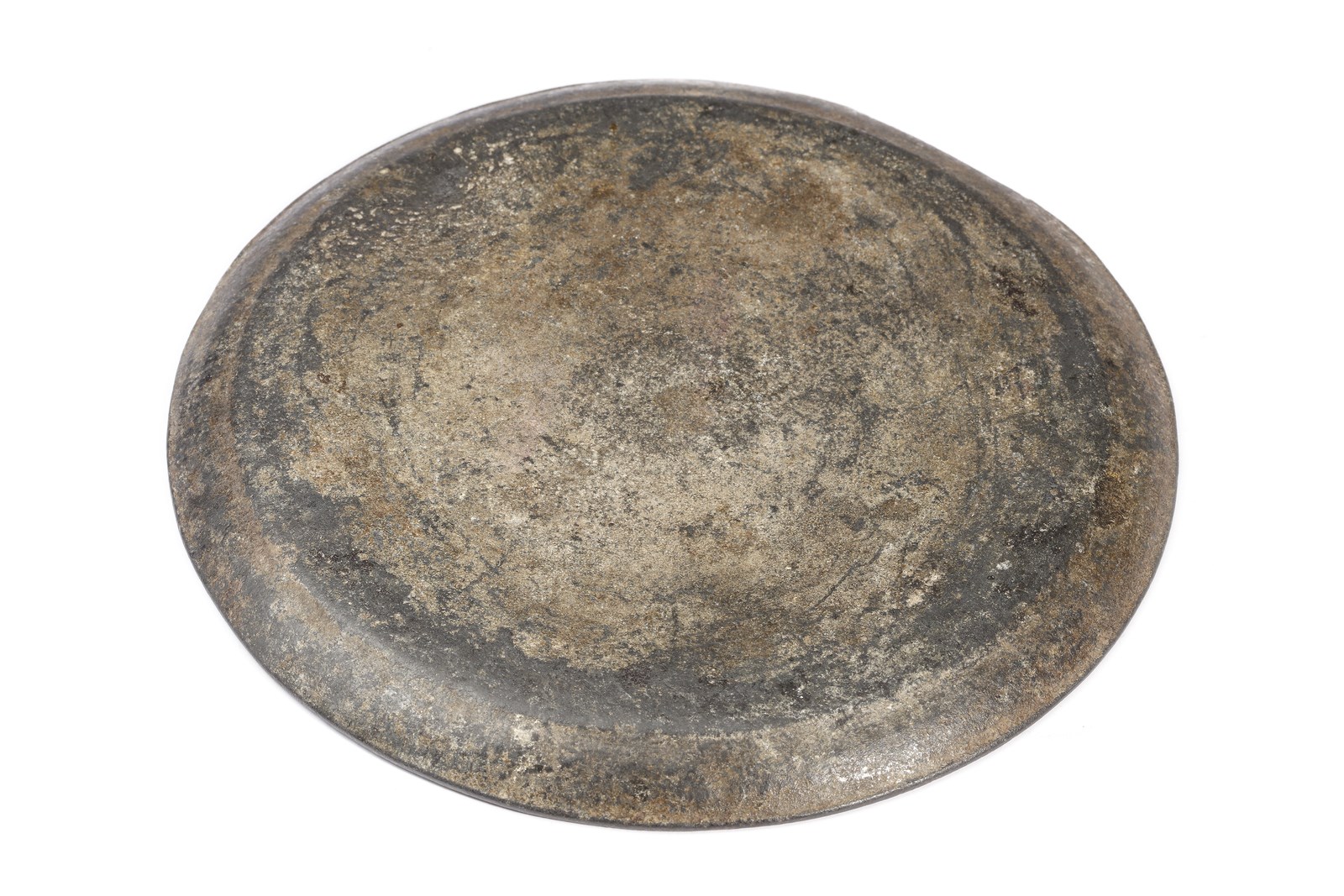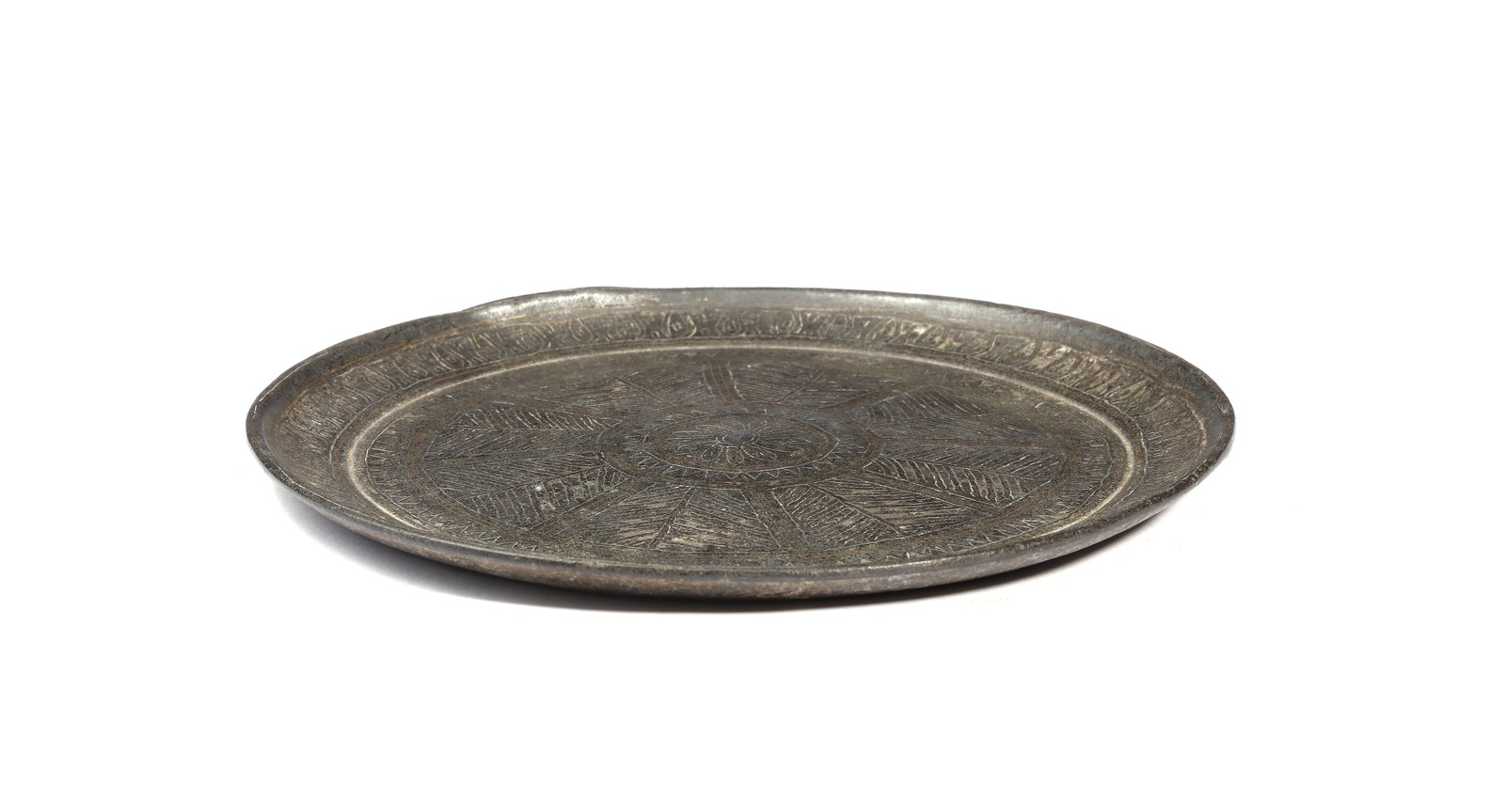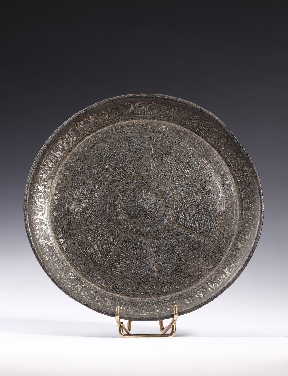 India, Deccan, Bidar, XVIII secolo . . Cm 18,00. Piatto circolare in lega di zinco e rame, intarsiato in filo d'argento entro pannelli radiali delimitati da filo d'ottone.