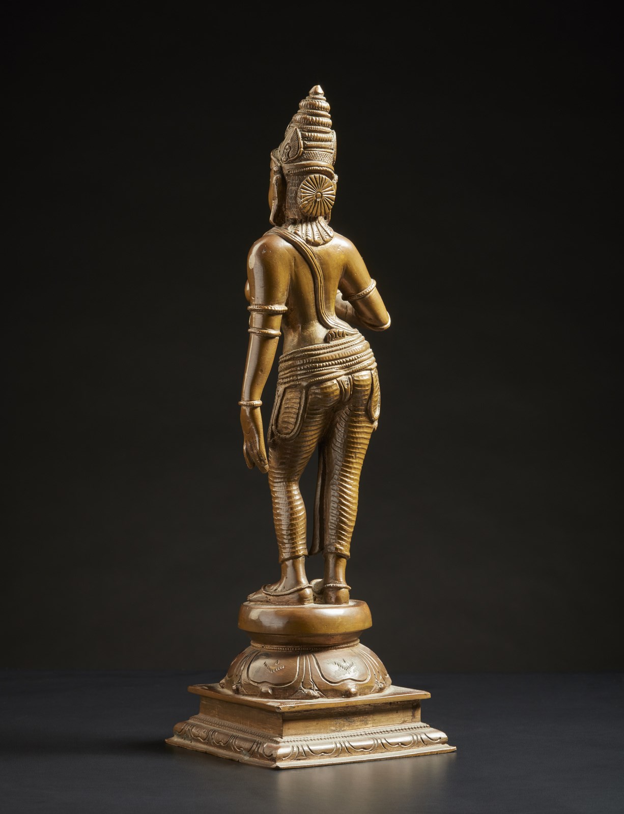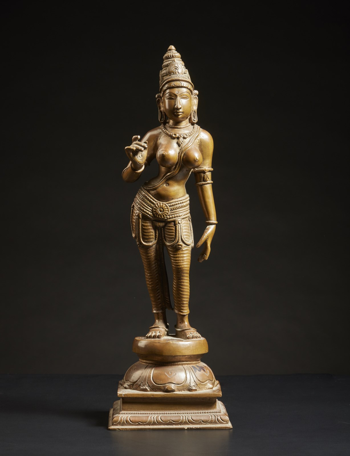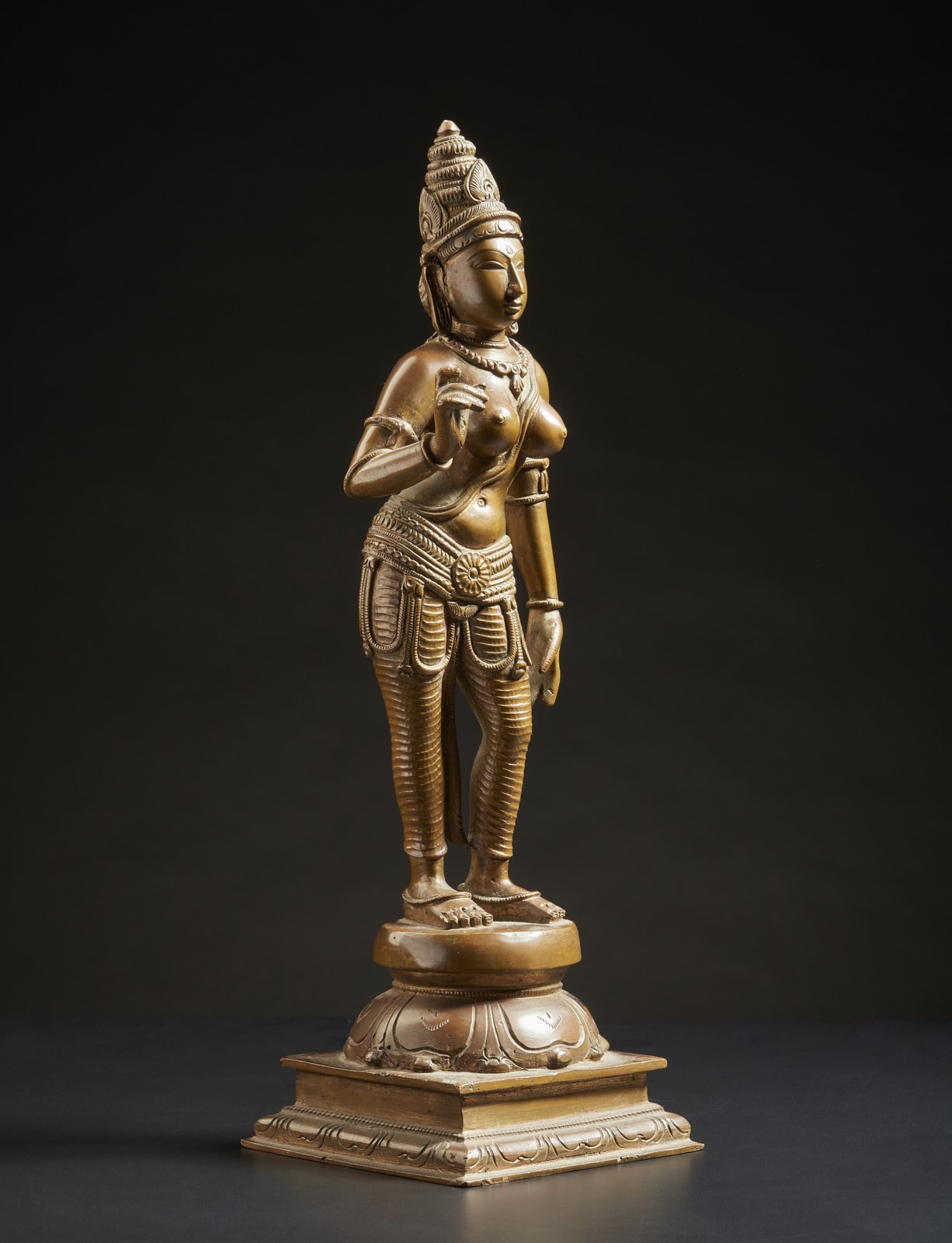 India, anni '90 . . Cm 9,50 x 31,50. Raffigurazione della dea Parvati realizzata con fusione a cera persa dall'artista indianoVarada Rajan, capo dell'atelier "Bronze Creative" in Tamil Nadu. La scultura ricalca i tradizionali canoni estetici del IX secolo, rispettando le proporzioni canonizzate negli antichi sutra indiani.