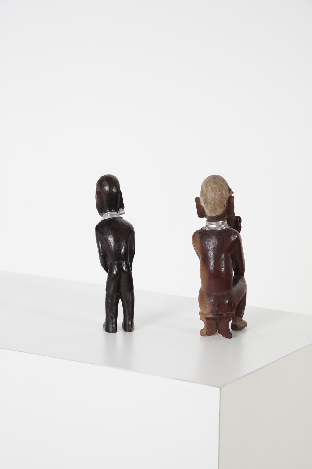Africa Centrale (?) . -. Cm 6,50 x 21,00 x 9,00. Lotto composto da due figurine in legno intagliato raffiguranti due giovani donne adornate da alto collare in filo metallico.