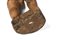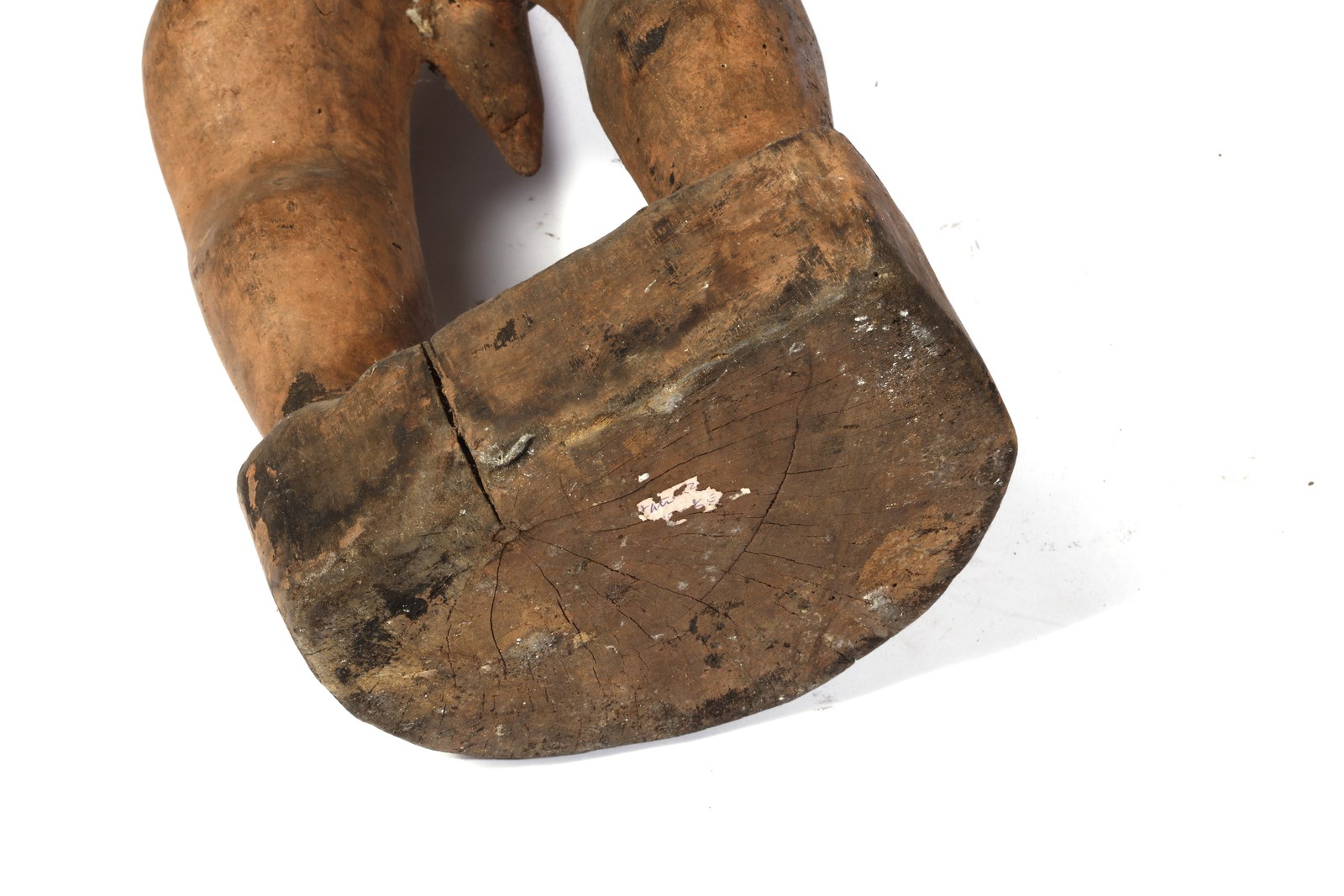 . . Cm 28,50 x 88,00. due grandi sculture in legno intagliato a patina rossa con inserti in metallo raffiguranti un giovane ed un anziano in piedi con le mani sul ventre.
