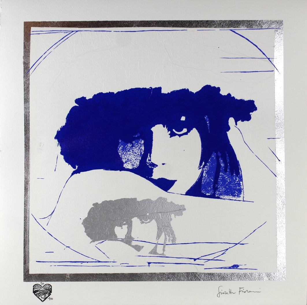 FIORONI GIOSETTA Roma 1932 “Doppio liberty blu e argento” serigrafia materica con pigmento blu e azzurro cm 50x50 del 2010. Firmata sul fronte in baso a destra, tiratura a sinistra.Certificato di autenticità a cura della Spirale Milano srl e autenticato dall'Archivio Parise Fioroni con timbro a secco.