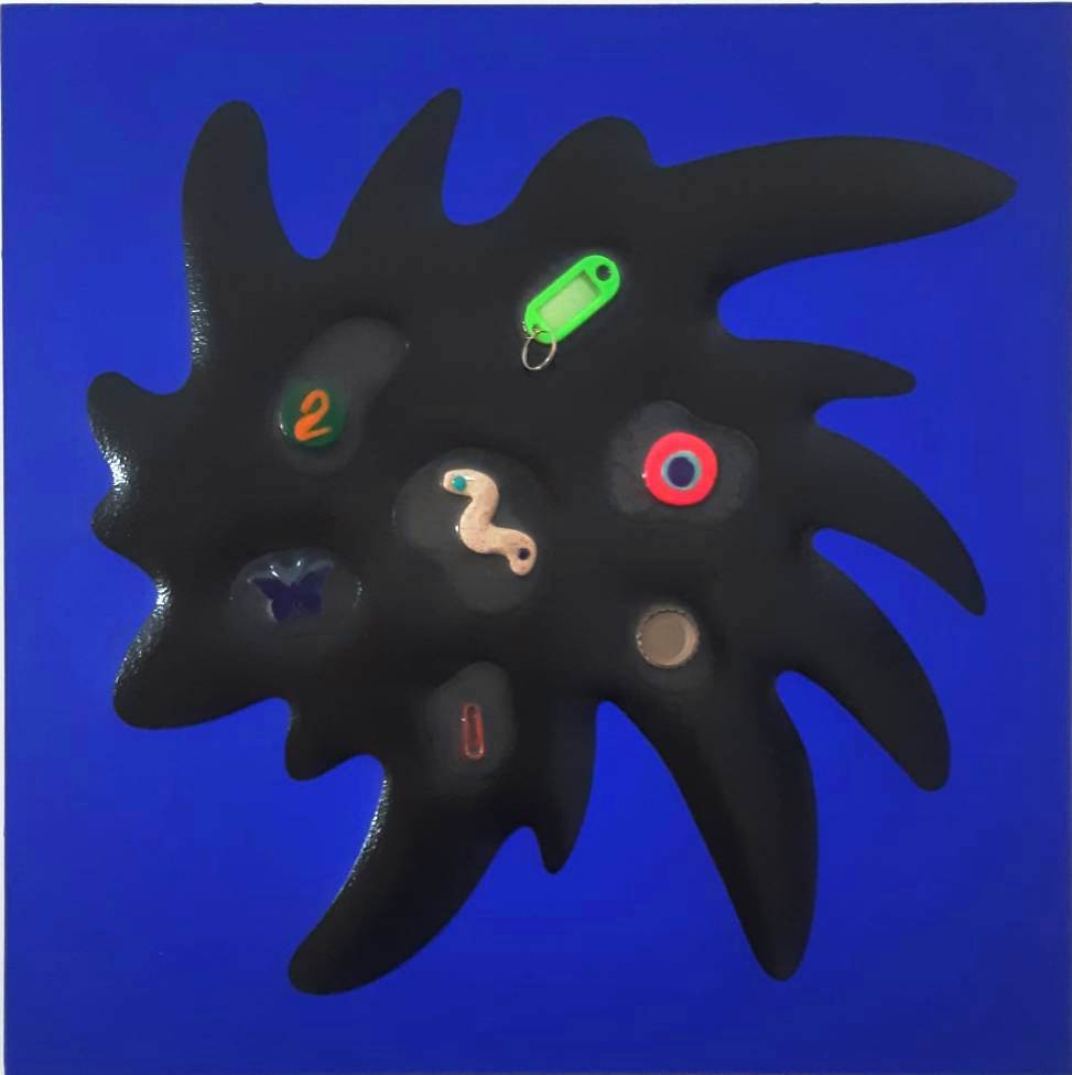 NUCARA RENZO Crema 1955 “Bang 10-37” legno, carta, colore serigrafico, resine e oggetti cm 50x50 del 2011. Firmato, datato e descritto al retro. Autentica ed archiviazione su foto a cura dell’artista.