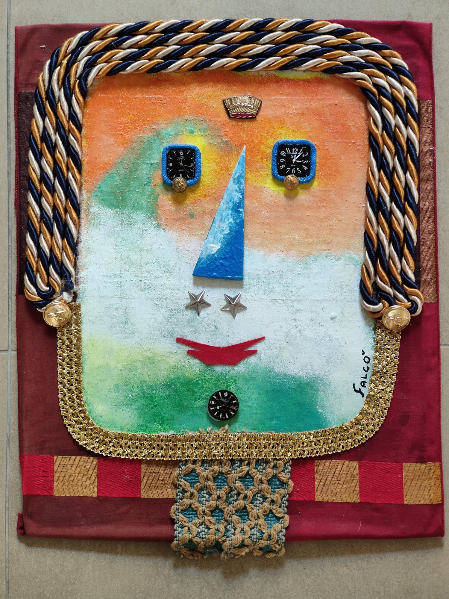 FALCO’ PASQUALE Foggia 1952 “Volto” tecnica mista e collage su mdf cm 50x38. Firmato sul fianco in basso a destra. Autentica su foto a cura dell’artista.