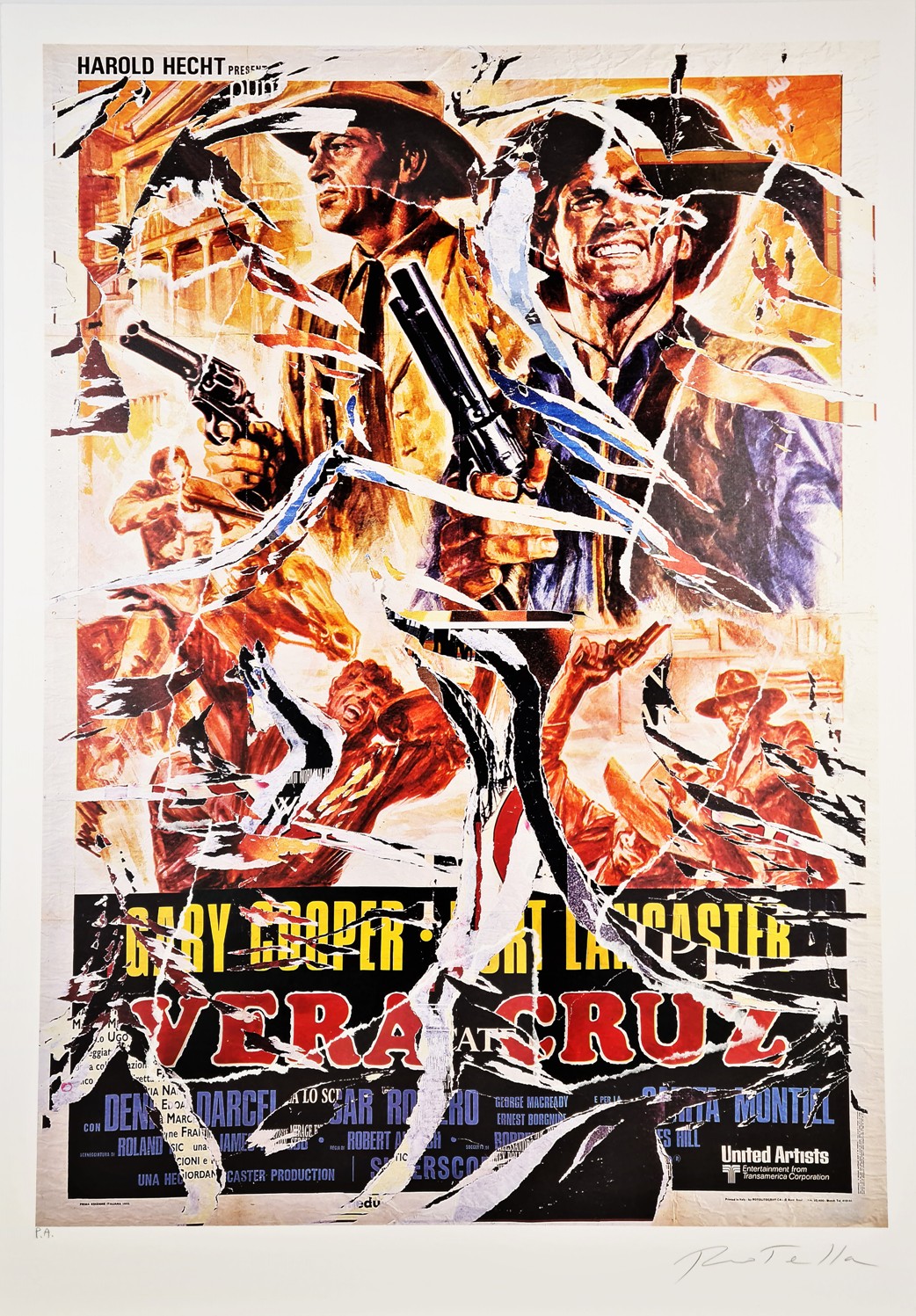 ROTELLA MIMMO Catanzaro 1918-Milano 2006 “Vera Cruz” multiplo decollage e strappi di manifesto su supporto serigrafico su cartoncino cm 70x100 del 2000-2009. Firmato sul fronte in basso a destra, tiratura P.A. Opera pubblicata sul catalogo "Mimmo Rotella multiplo decollage" Silvana Editore a pag. 86 e 87.