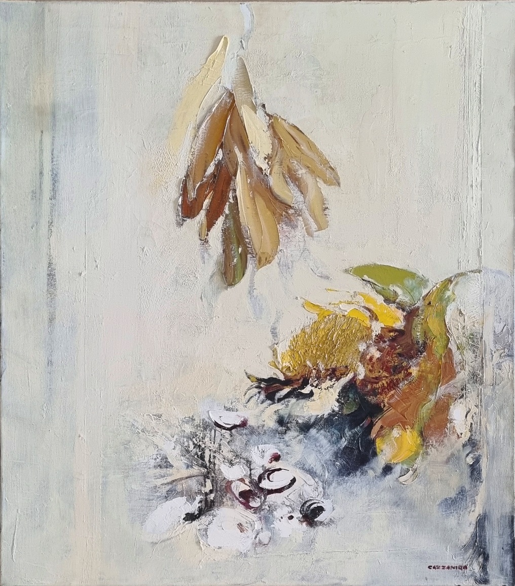 CAZZANIGA GIANCARLO Monza 1930-2013 "Interno” olio su tela cm 80x90 del 1976-1985. Firmato sul fronte in basso a destra. Sul retro intitolato e datato.
