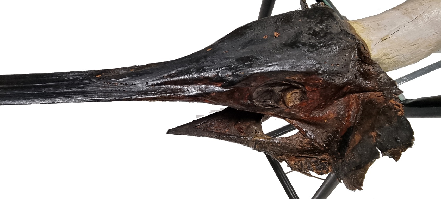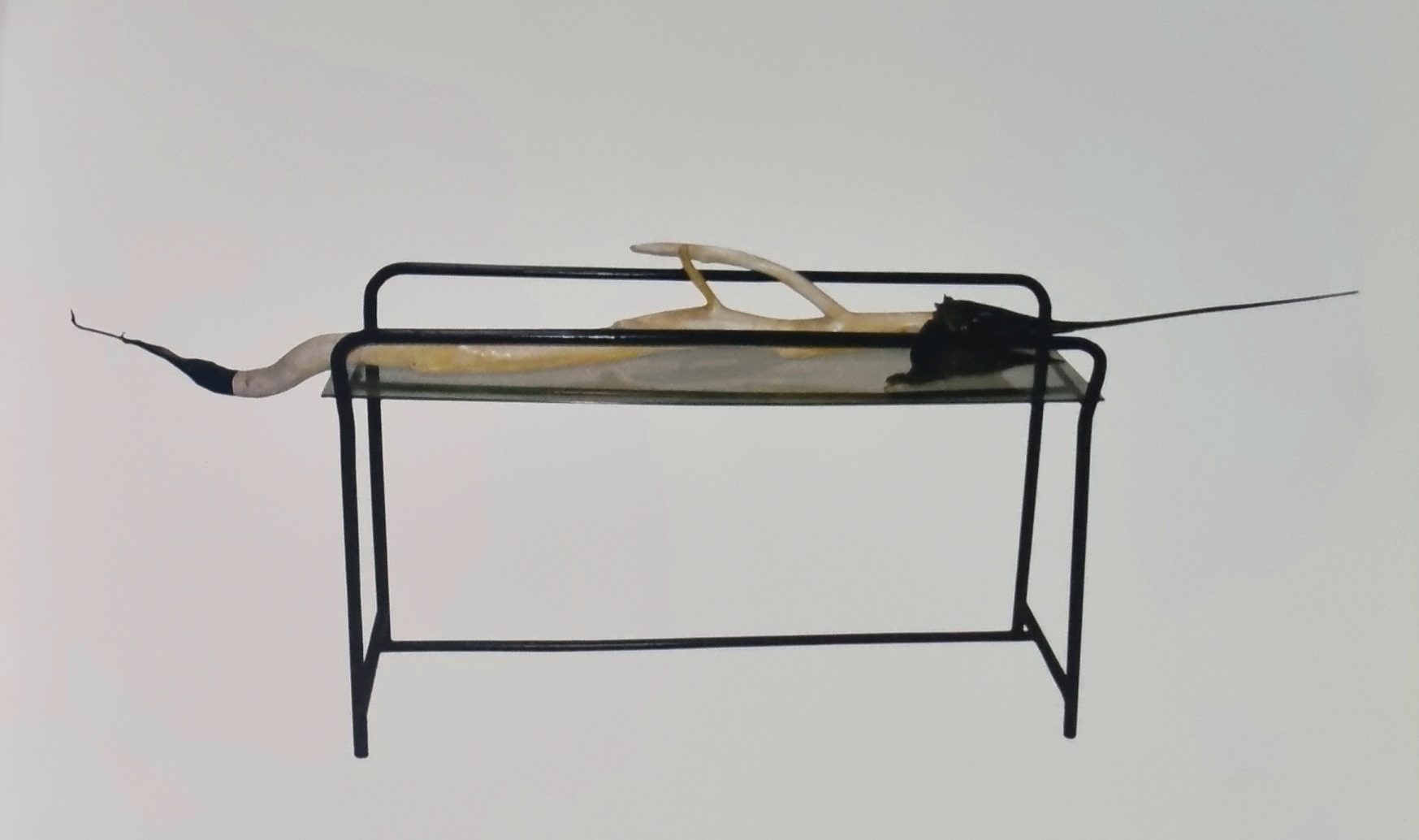 COSTA CLAUDIO Tirana 1942-Genova 1995 “Senza titolo” del 1992, ferro, legno, vetro, pesce vela, cm 90x225x50 del 1992. Pubblicato a piena pagina 39 del catalogo n°1 della ”Biennale di Malindi” kenya. Catalogo a corredo.