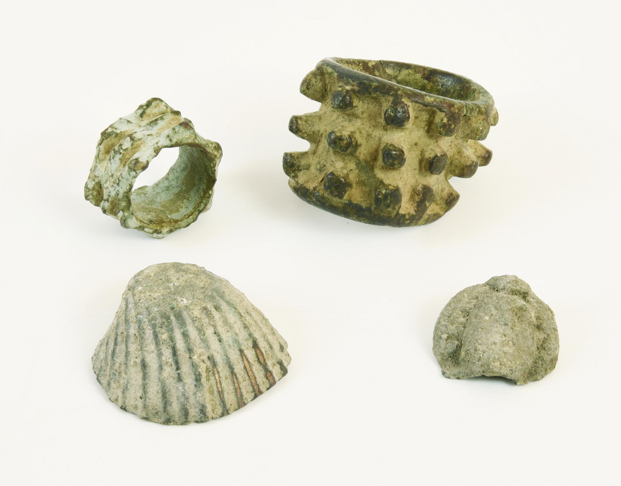 Due anelli, uno esagonale con rilievi paralleli, l'altro cilindrico con elementi cilindrici sporgenti, una conchiglia ed un volto femminile