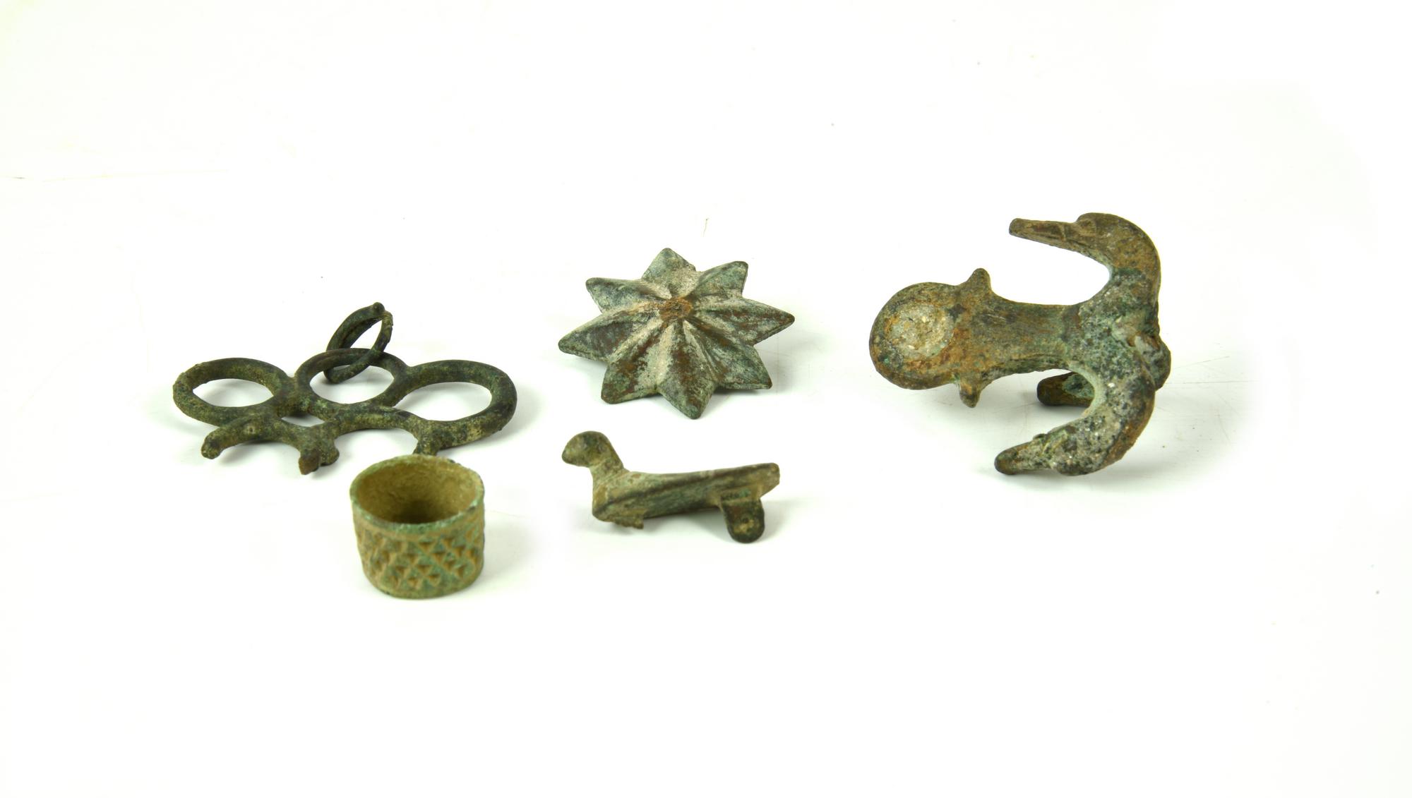 Ancoretta a tre ganci con estremità modellate a testa d'oca e anello per la sospensione, integra; fibula modellata a colomba con le ali chiuse, priva di molla e ardiglione; applique a stella ad otto punte; ditale in lamina di bronzo; pendente ad anelli sovrapposti su due registri, lacunoso