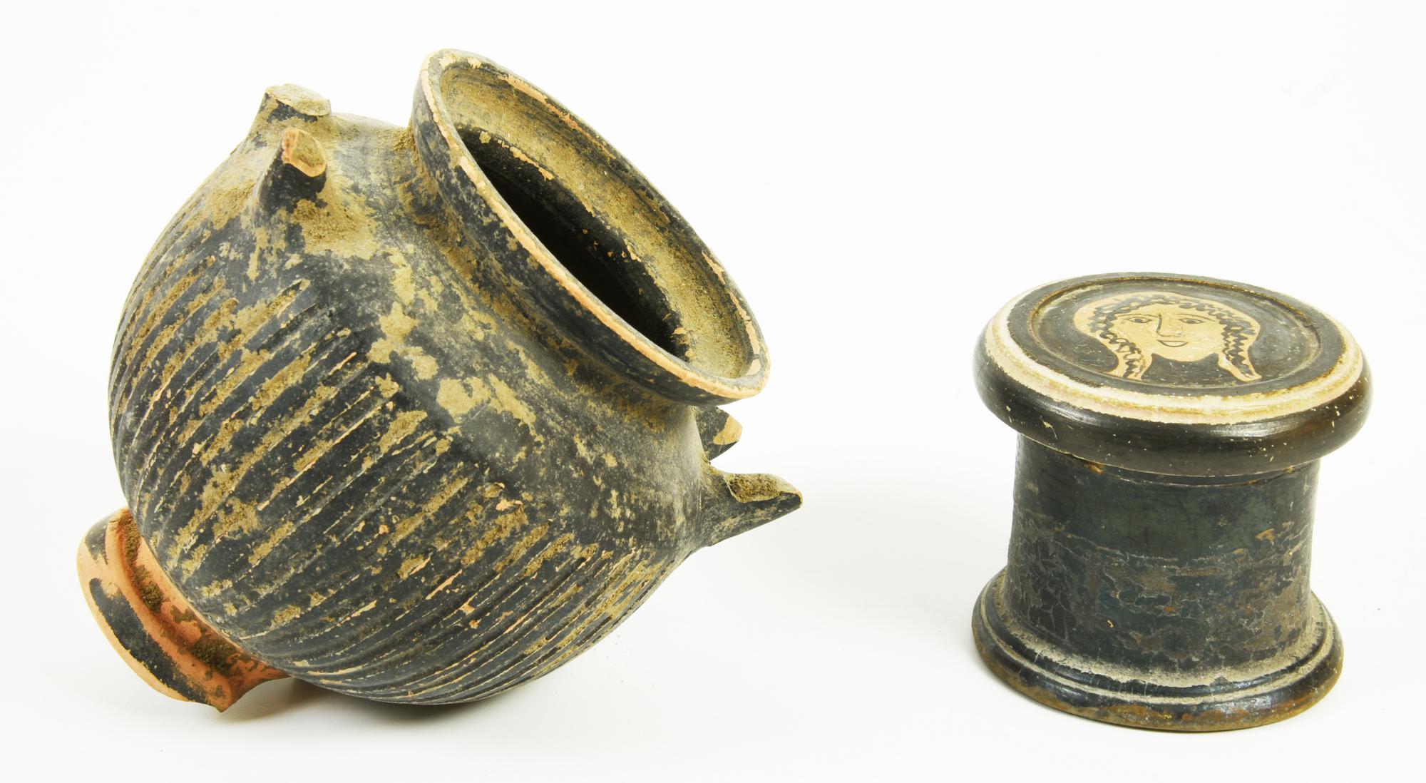 Pisside cilindrica con coperchio decorato da profilo femminile frontale con lunghi capelli ricci; stamnos con orlo estroflesso, breve collo a profilo concavo, spalla obliqua, corpo ovoide baccellato, piede ad echino, anse a bastoncello impostate obliquamente sulla spalla