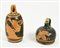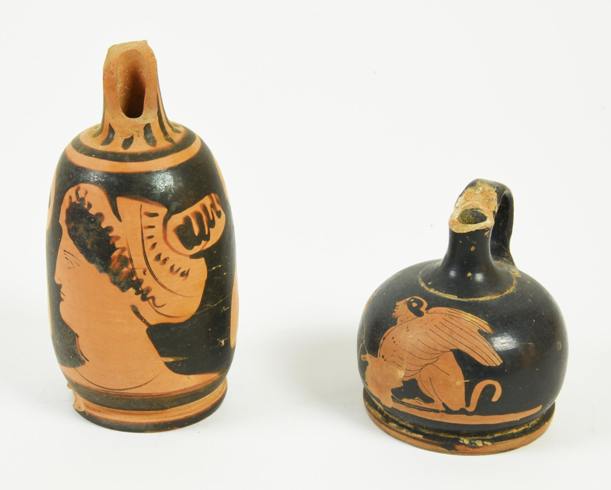 Due lekythoi una con corpo ovoide e piede ad anello decorata sul collo con falsa baccellatura, sotto l'ansa con palmetta aperta a ventaglio e profilo femminile volto a destra; lekythos ariballica con corpo lenticolare schiacciato e piede ad anello decorata con sfinge accosciata volta a destra