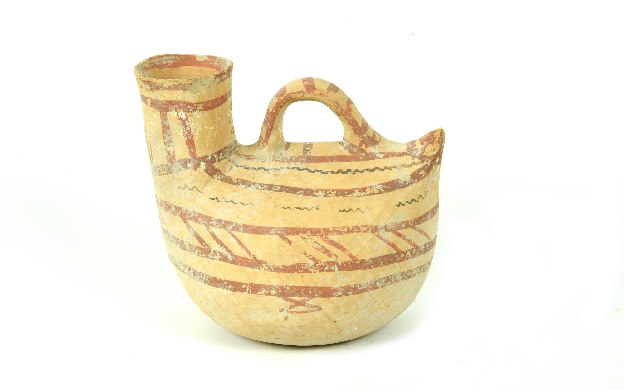 Askos con orlo lievemente svasato indistinto dal collo cilindrico, corpo globoso allungato, con estremità posteriore appuntita, fondo piatto; ansa a nastro impostata longitudinalmente sul dorso, decorato a fasce orizzontali e motivi diagonali
