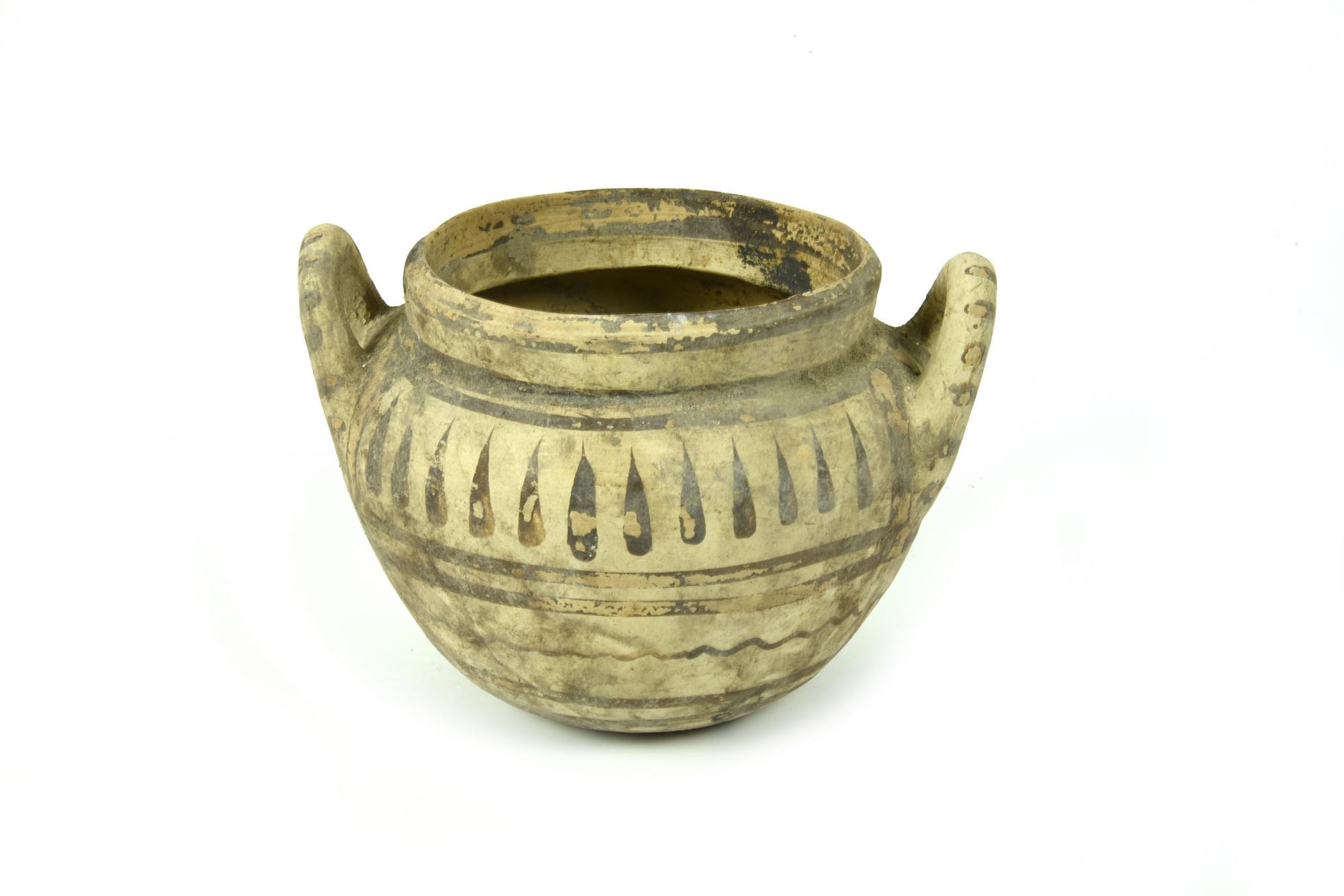 Olletta con orlo a colletto, distinto dal corpo troncoconico, fondo piatto, anse a bastoncello impostate obliquamente sulla spalla; decorata a fasce sul corpo e falsa baccellatura sulla spalla
