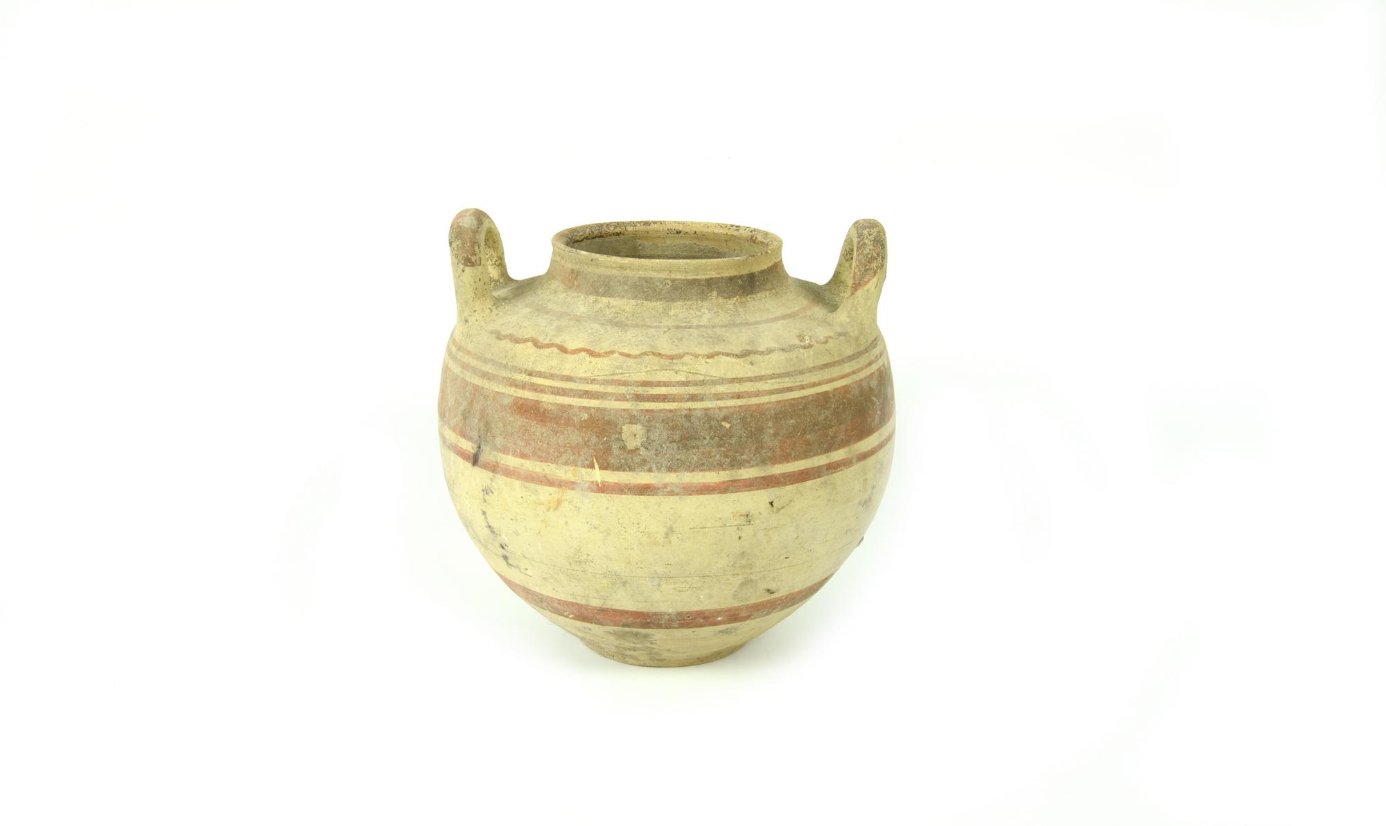 Stamnos con orlo a colletto, distinto dal corpo globoso, piede a disco, anse a bastoncello impostate verticalmente sulla spalla; decorato sulla spalla con motivo a tremolo e a fasce e filetti sul corpo