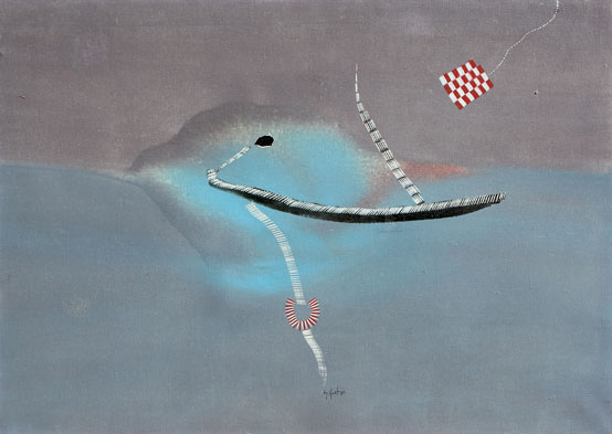 DANGELO Sergio (Milano 1932) Mare dimenticato, 1964 olio su tela, cm. 50 x 70 Autentica della galleria Arte Silva, Seregno Firma, data 'S. Dangelo, 1964' (in basso al centro) #Firma, data, titolo, misure 'Sergio Dangelo, 1964, Mare dimenticato, 70x50 cm'; #etichetta e timbro della galleria Arte Viva, Vittoria RG (al retro)