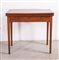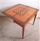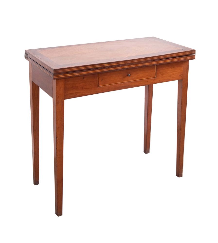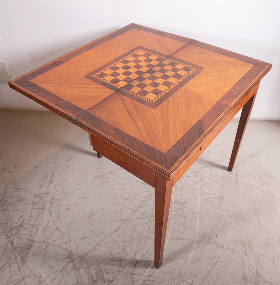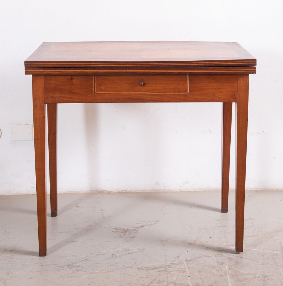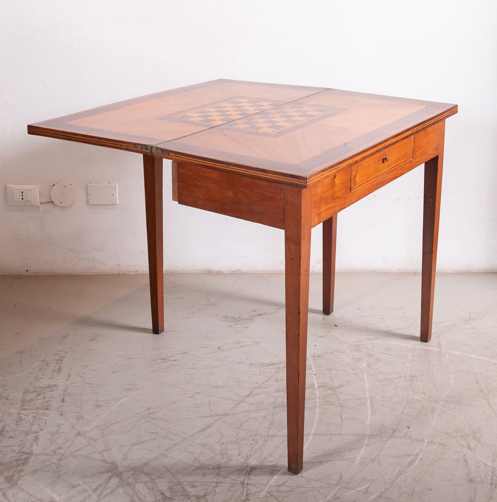 Tavolino da gioco in massello di cliegio con piano lastronato in ciliegio e noce, con motivi a scacchiera. Emilia, inizi del XIX secolo. Cm 79x88x44 (chiuso), 79x88x88 (aperto).