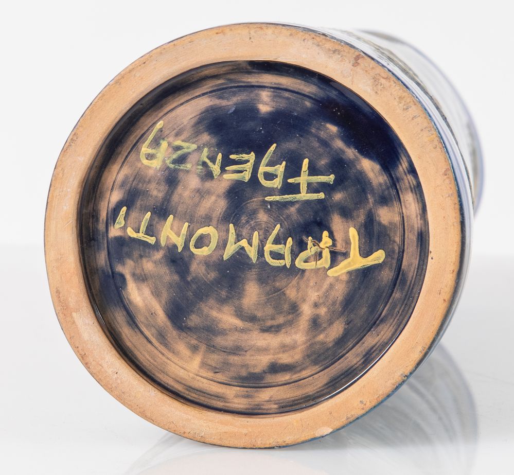 TRAMONTI Vaso in ceramica smaltata. Faenza, XX secolo. Cm 33xØ12,5. Sotto la base reca firma Tramonti Faenza.