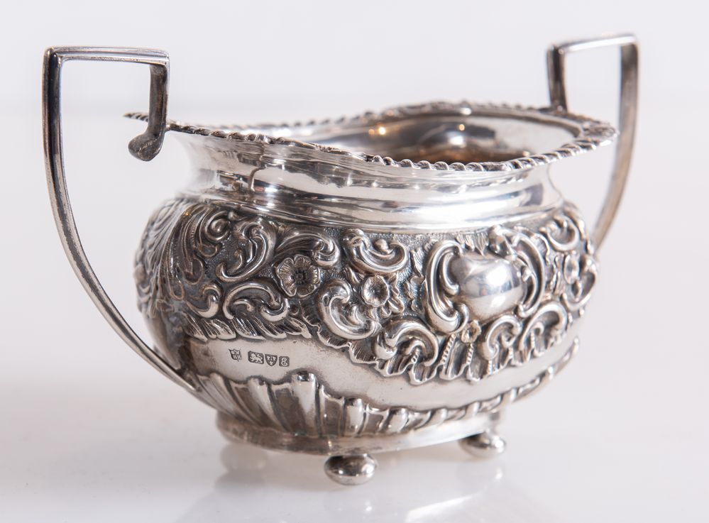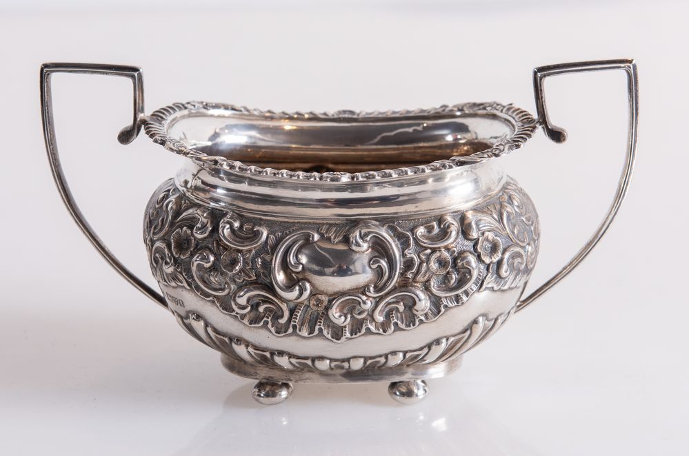 GEORGE NATHAN & RIDLEY HAYES, Chester, 1905. Alzata in argento 925 con manici squadrati. Sul lato reca punzoni: GNRH, leone passant, stemma della città di Chester, lettera dataria E. Cm 11x20x10,5. Peso: 276 gr.