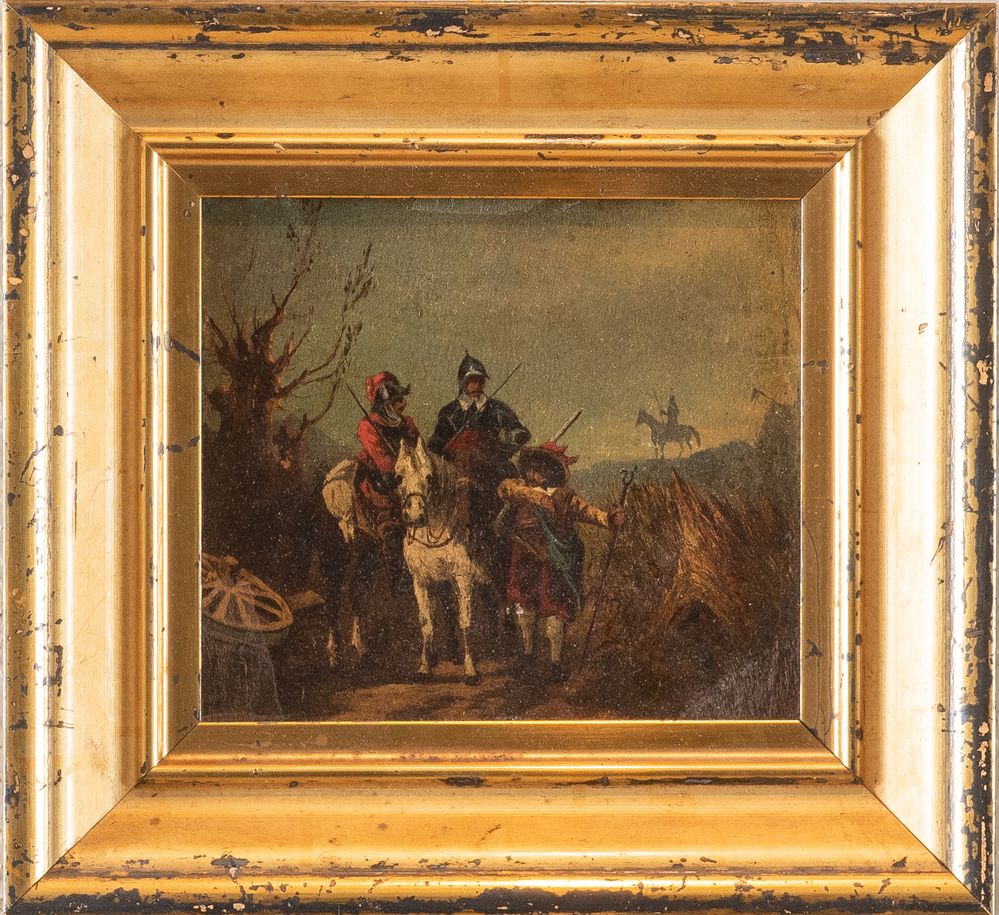 Maestro del XIX secolo. "Scena cittadina con cavalli". Olio su carta. Cm 14,5x28,5.