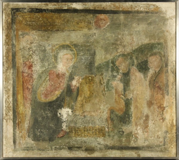 Firmato. Affresco raff. ''SACRA FAMIGLIA''. XVII secolo. Restauri. Mis. Lung. cm. 90 Alt. cm. 80 ca.