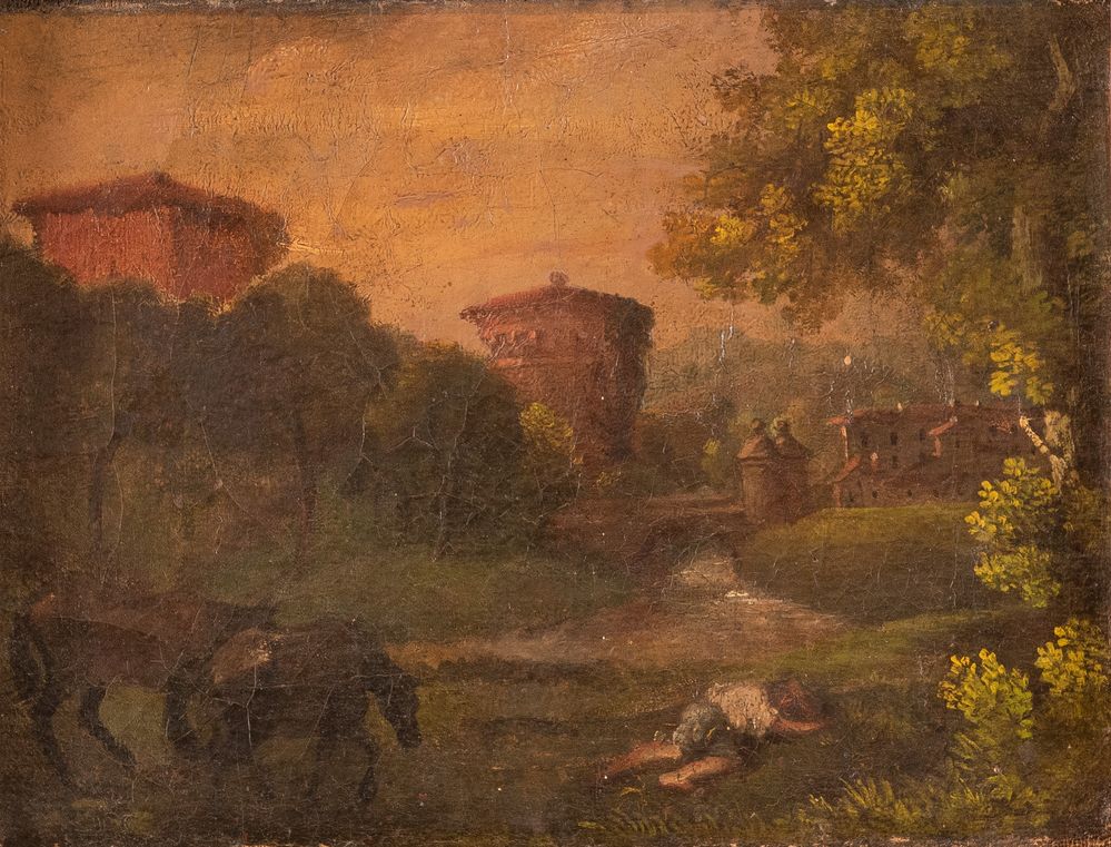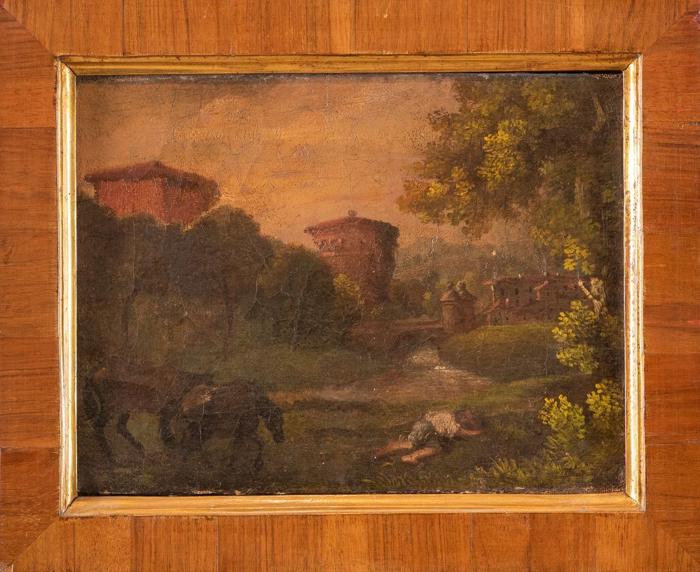 Maestro del XIX secolo. "Paesaggio". Olio su tela. Cm 25x32. (restauri)