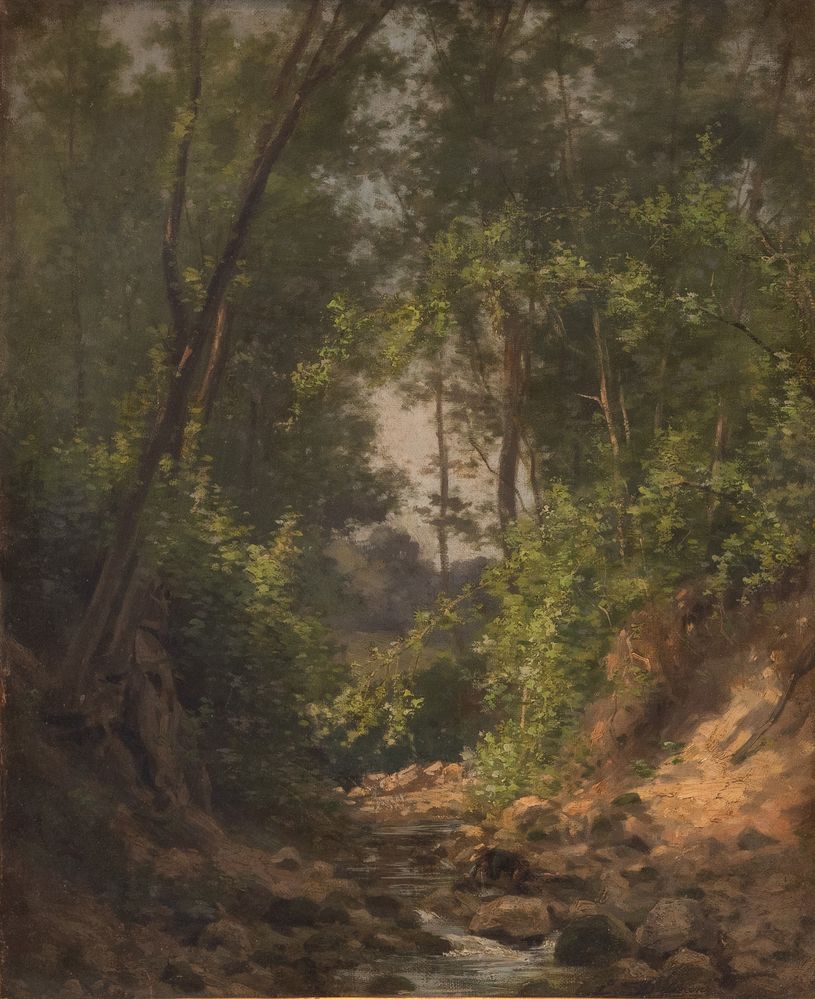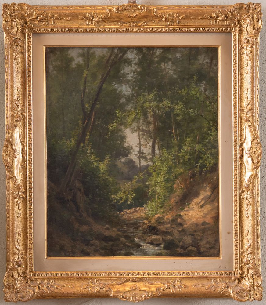 Maestro della fine del XIX secolo - inizi del XX secolo. "Paesaggio". Olio su tela. Cm 50x41. Opera firmata in basso a destra con firma indecifrata.