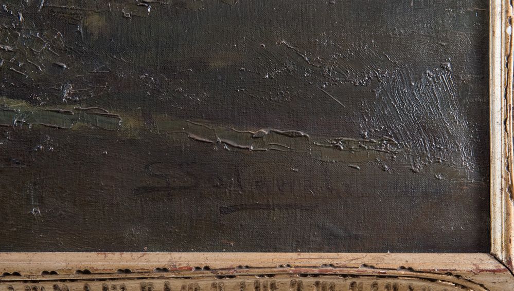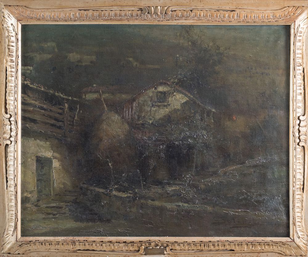 GIUSEPPE SOLENGHI (Milano 1879 - Cernobbio 1944) "Paesaggio con case", 1919. Olio su tela. Cm 80x100. Opera firmata e datata in basso a destra G. Solenghi 1919.