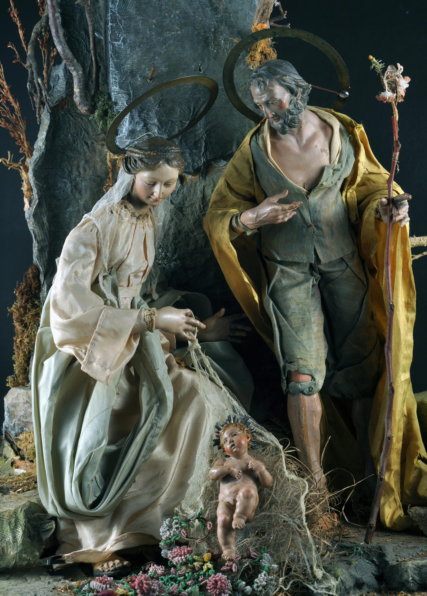 Lotto composto da: a) Gruppo della Natività con San Giuseppe h cm 34,5; Madonna h cm 34,5, Bambin Gesù in legno cm 10