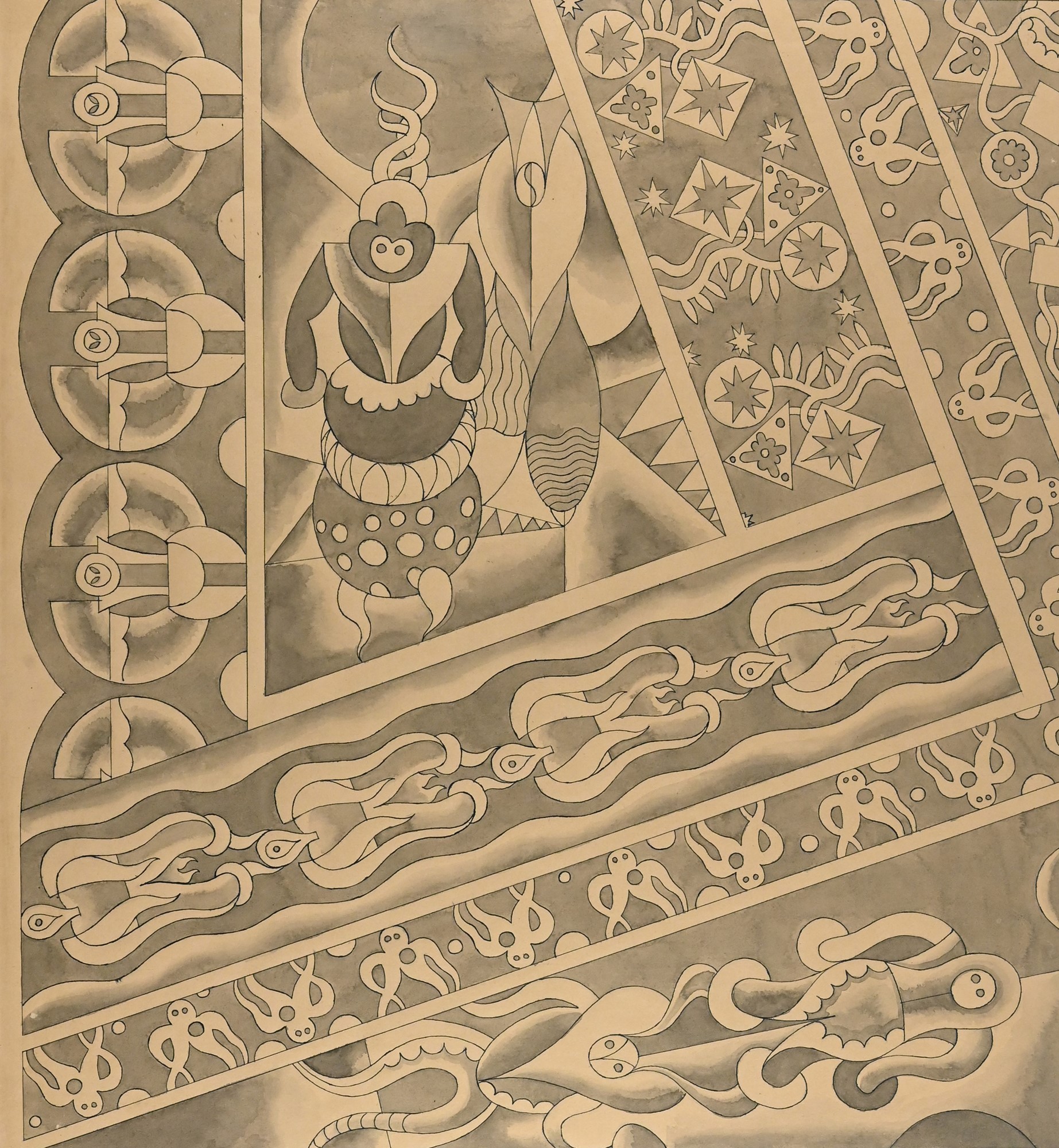 Si tratta di un progetto per la realizzazione di una decorazione murale con le tipologie deperiane del tempo (fiori maschere alate e personaggi di caucciù per il Teatro magico Depero). Fu probabilmente commissionato da Umberto Notari, direttore dell'Ambrosiano di Milano, che già stava acquistando da Depero varie opere, bozzetti pubblicitari e grandi arazzi, la sua collocazione era probabilmente la sua villa di Monza.