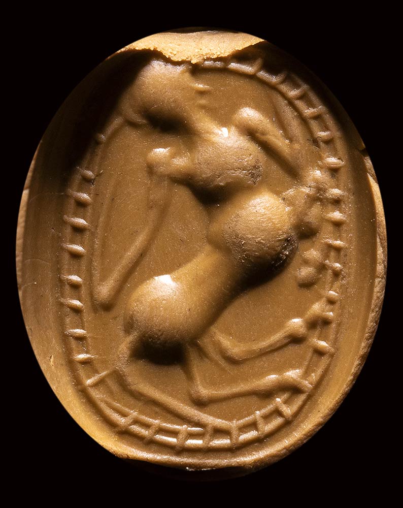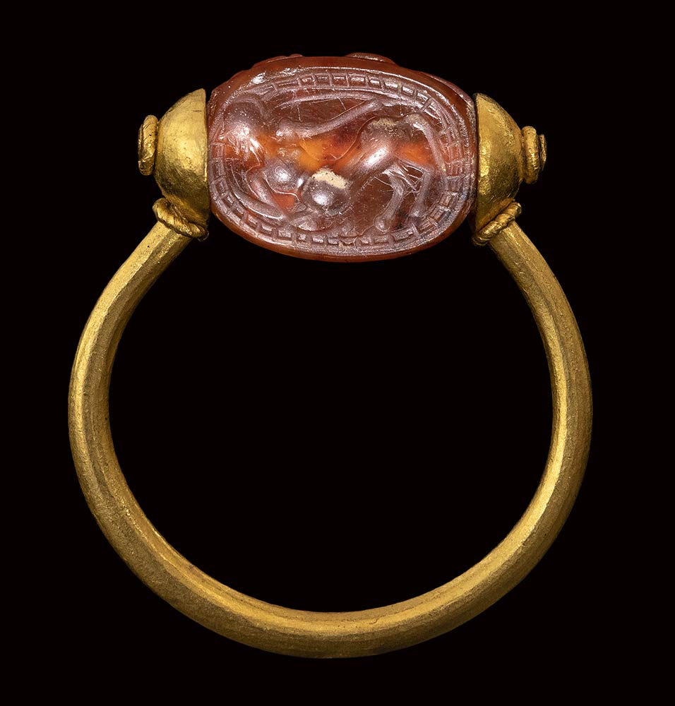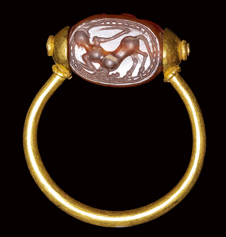 An etruscan carnelian scarab set in a gold swivel ring. Centaur. 4th century B.C.