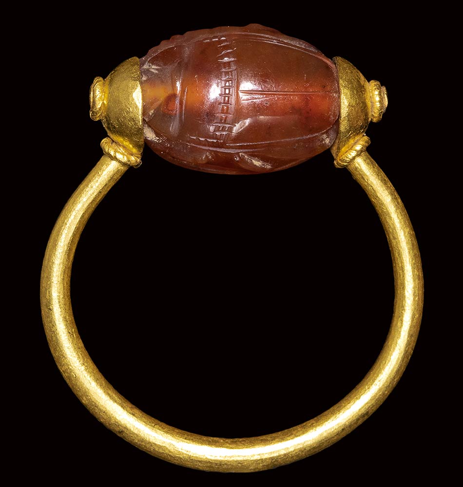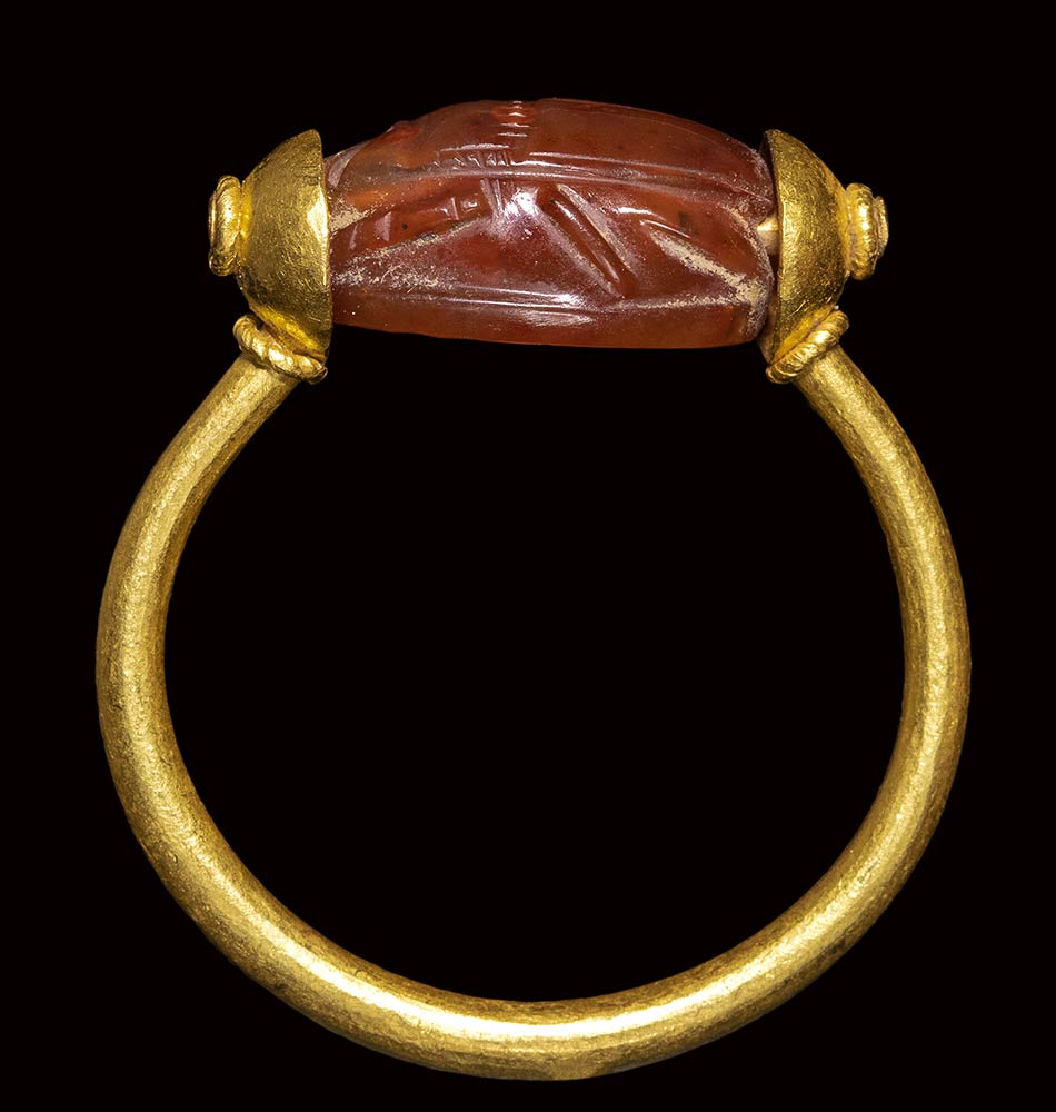 With plain rounded hoop bordered at the endings with twisted wire. Disks in the center fixed to the scarab by a transpiercing gold pin endings with twisted wire. The carnelian scarab is well detailed with hatching on the lower edge of the thorax and upon the plinth. The underside is engraved with a Centaur turned left. Use of globular elements for the head and the body. Cable border. Wear marks.