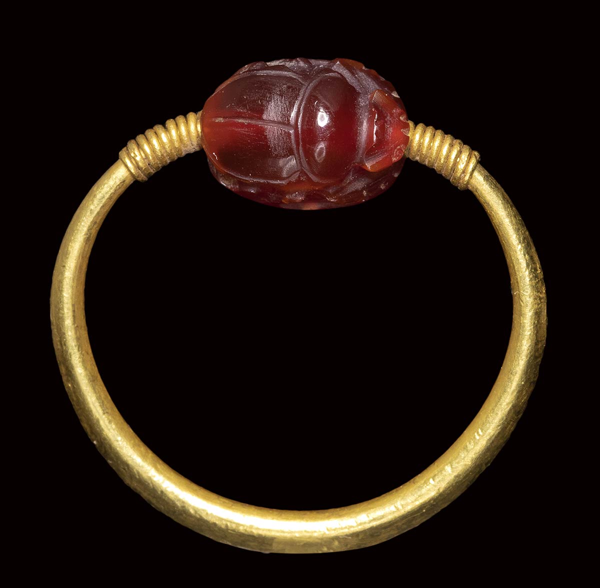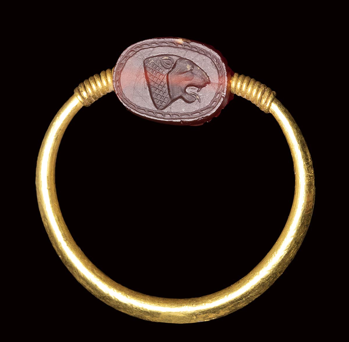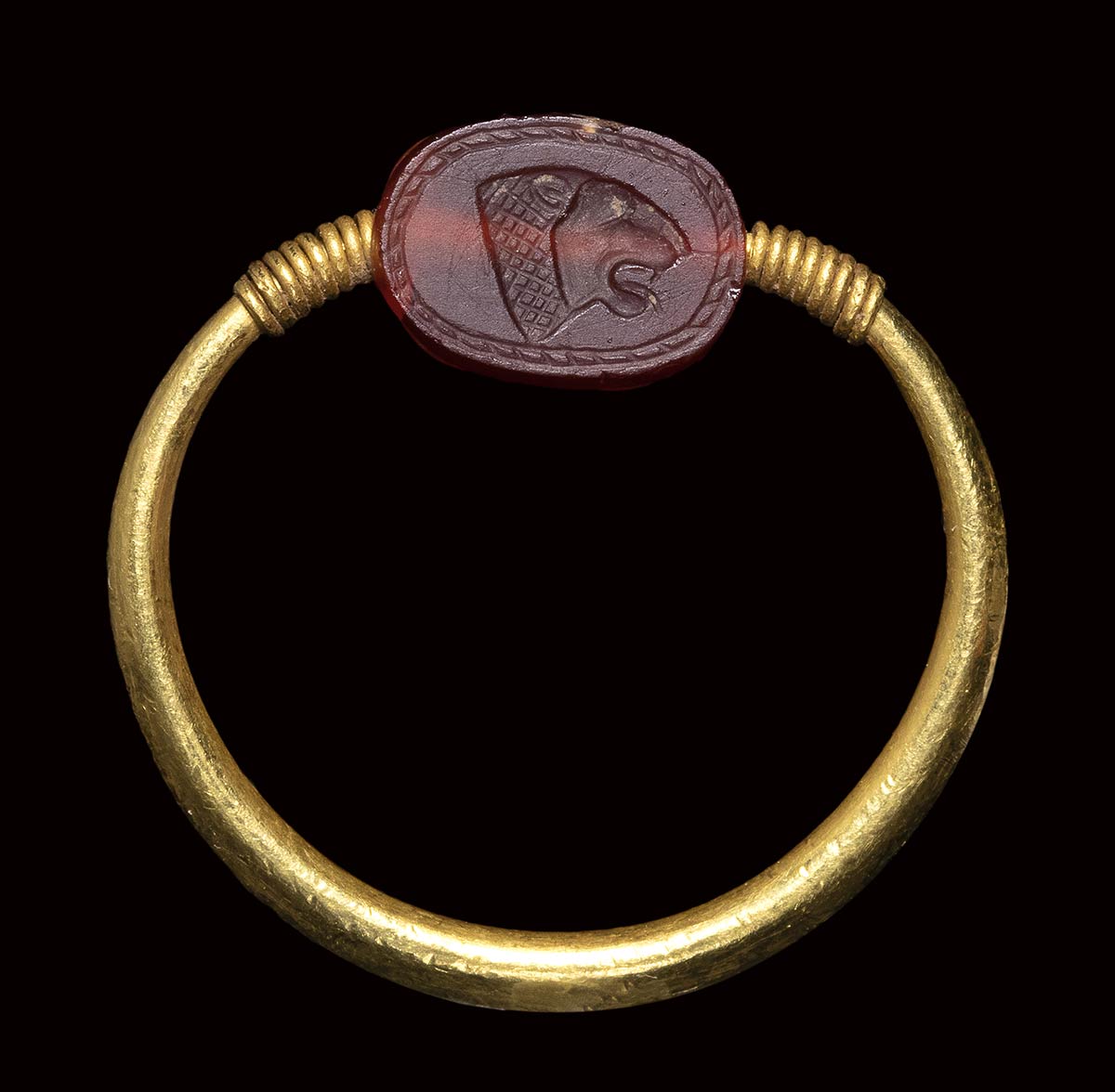 A rare small Phoenician carnelian scarab set in a gold swivel ring. Lion head.<br><br>6th century B.C, circa 500 B.C.