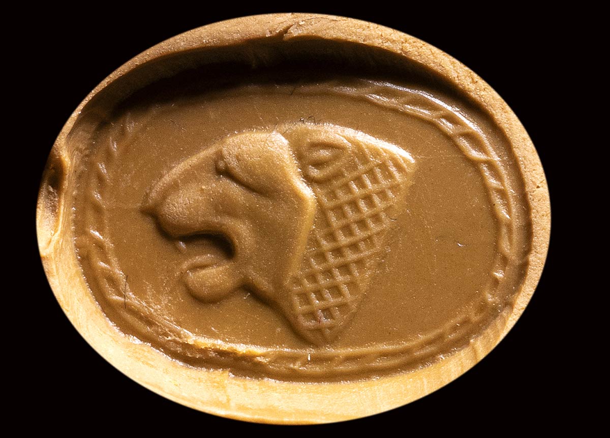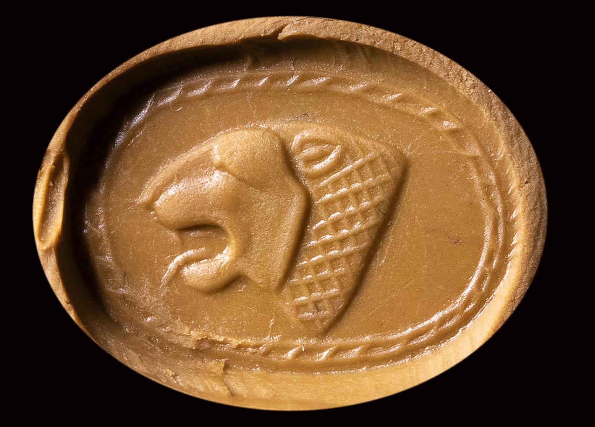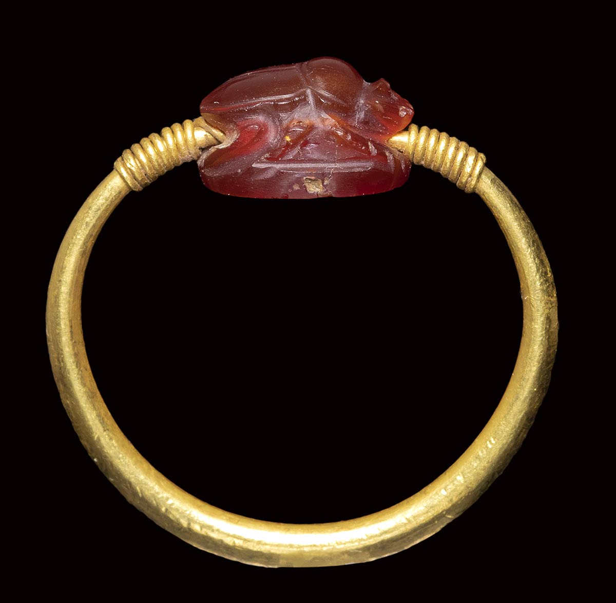 A rare small Phoenician carnelian scarab set in a gold swivel ring. Lion head.<br><br>6th century B.C, circa 500 B.C.