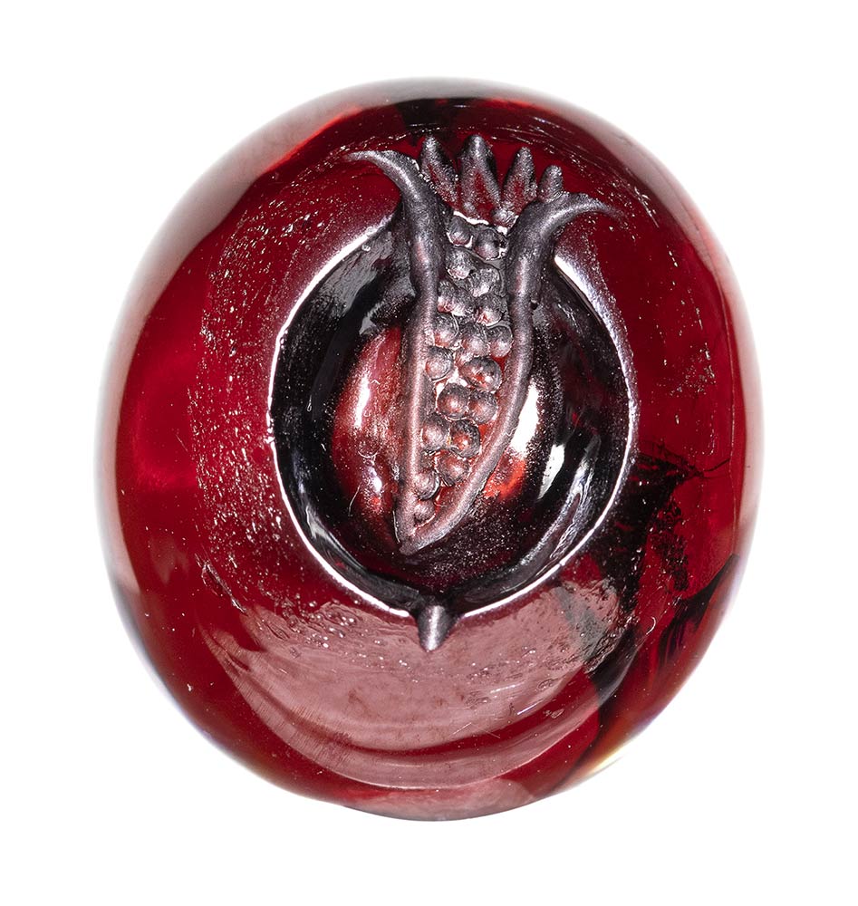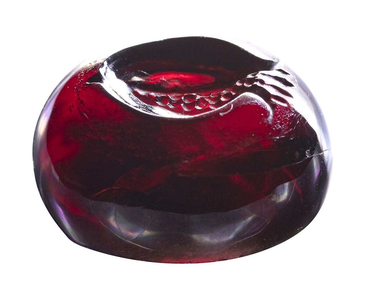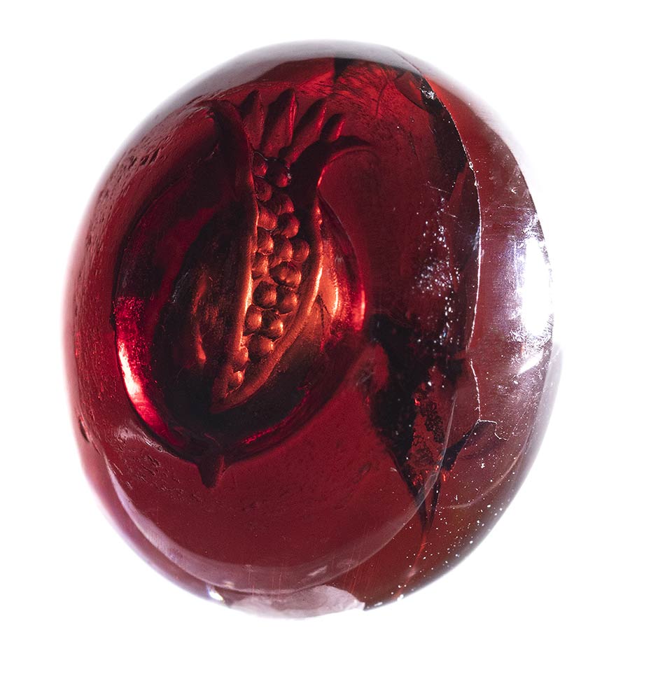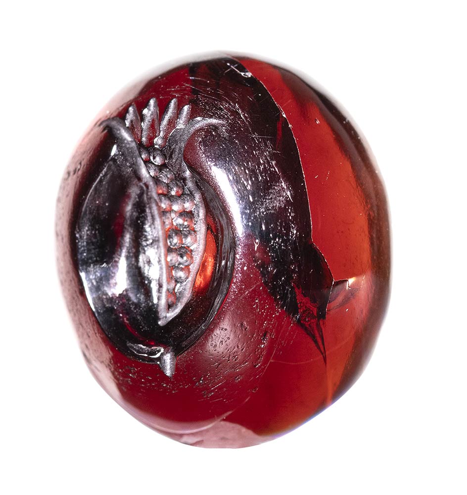A slightly open pomegranate with a natural central “laceration”, with its internal seeds visible. Rare and unusual representation of a fruit breaking and opening. The subject, present in the Greek coinage but whole without openings with visible seeds, is engraved in a beautiful high convex cabochon garnet, with a concave back. The combination of the subject with the material was masterfully chosen to allude its natural color. Mirror polishing. Extremely detailed and deeply carved intaglio. Slight internal crack (non-passing and not dangerous; the gem is solid). Wear marks. Parallel: See greek coinage: for the subject of the pomegrenate cfr. Side. Circa 430-400 BC. Stater, Pomegranate with its stem above and flower below. SNG France 627. SNG von Aulock 4765; Pamphylia, Side AR Stater. Circa 490-450 BC. Pomegranate, ΣIΔH (retrograde) to left; all within beaded circular border; Melos - ΜΑΛΟΣ - date: ca. 450-440 BC - silver stater - description obverse: pomegranate.