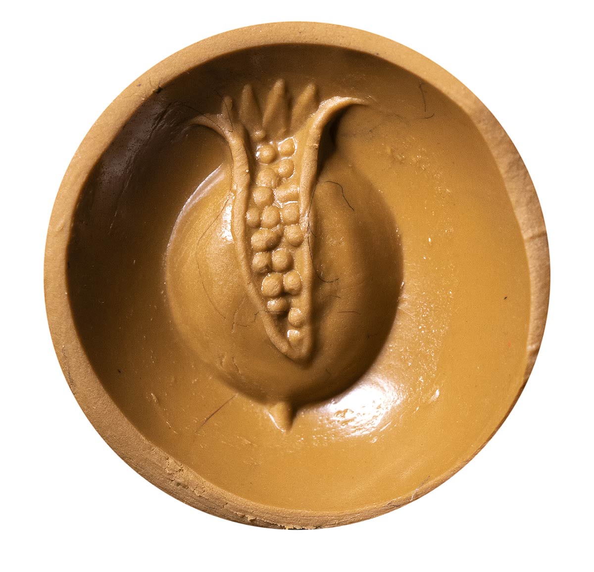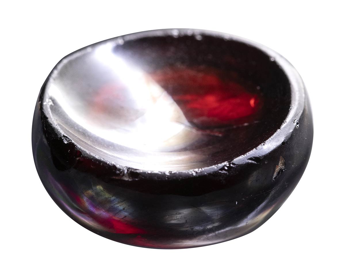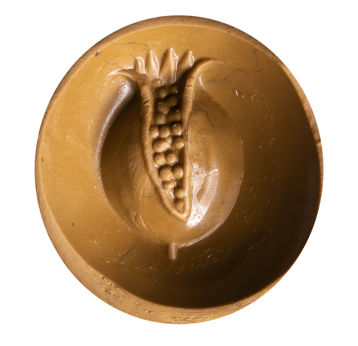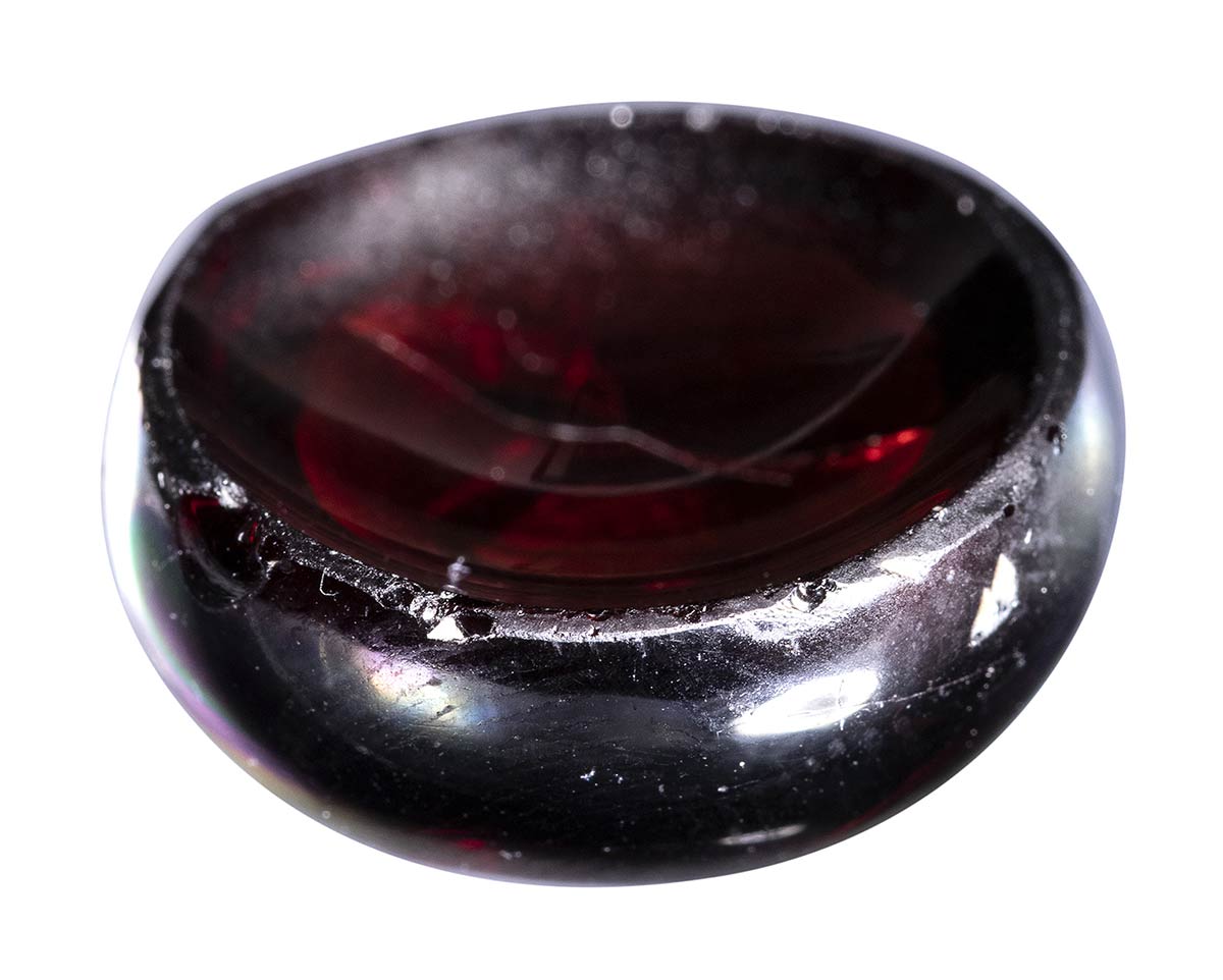 A slightly open pomegranate with a natural central “laceration”, with its internal seeds visible. Rare and unusual representation of a fruit breaking and opening. The subject, present in the Greek coinage but whole without openings with visible seeds, is engraved in a beautiful high convex cabochon garnet, with a concave back. The combination of the subject with the material was masterfully chosen to allude its natural color. Mirror polishing. Extremely detailed and deeply carved intaglio. Slight internal crack (non-passing and not dangerous; the gem is solid). Wear marks. Parallel: See greek coinage: for the subject of the pomegrenate cfr. Side. Circa 430-400 BC. Stater, Pomegranate with its stem above and flower below. SNG France 627. SNG von Aulock 4765; Pamphylia, Side AR Stater. Circa 490-450 BC. Pomegranate, ΣIΔH (retrograde) to left; all within beaded circular border; Melos - ΜΑΛΟΣ - date: ca. 450-440 BC - silver stater - description obverse: pomegranate.