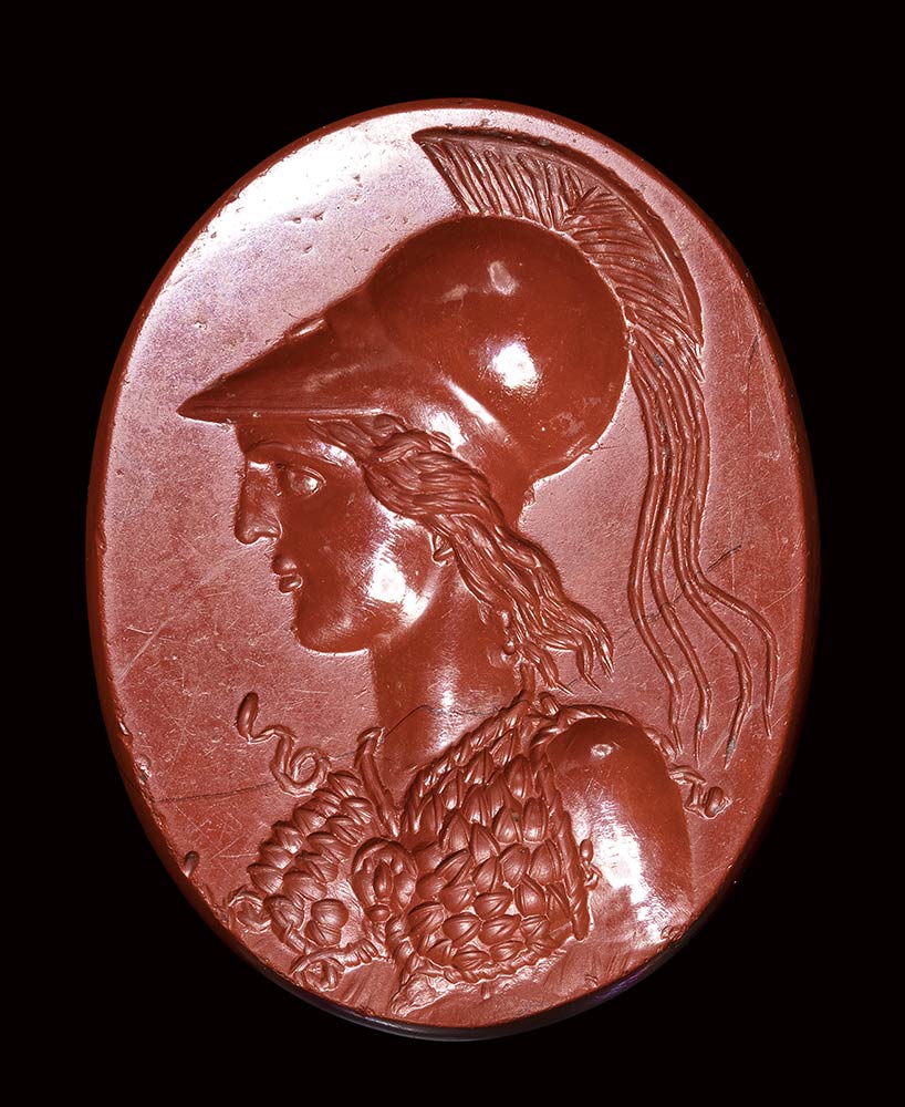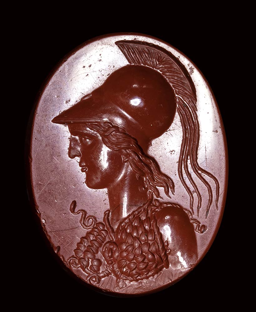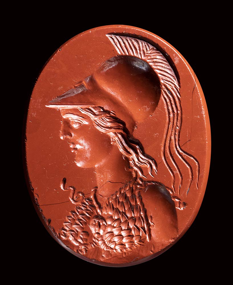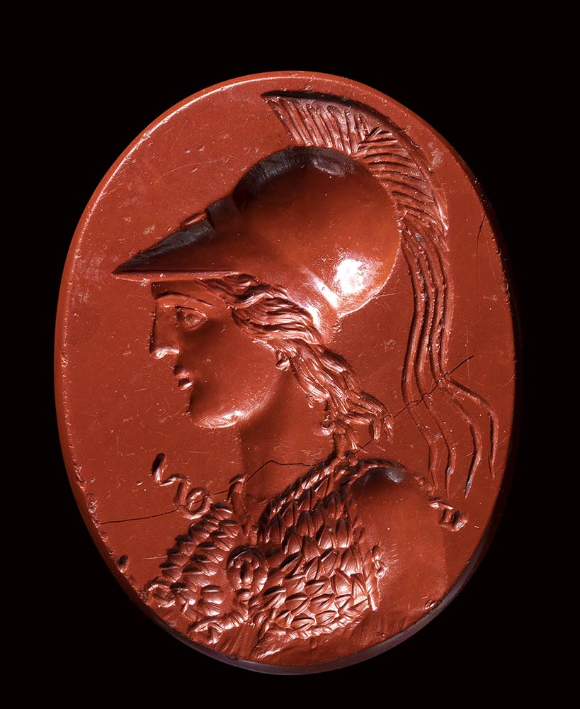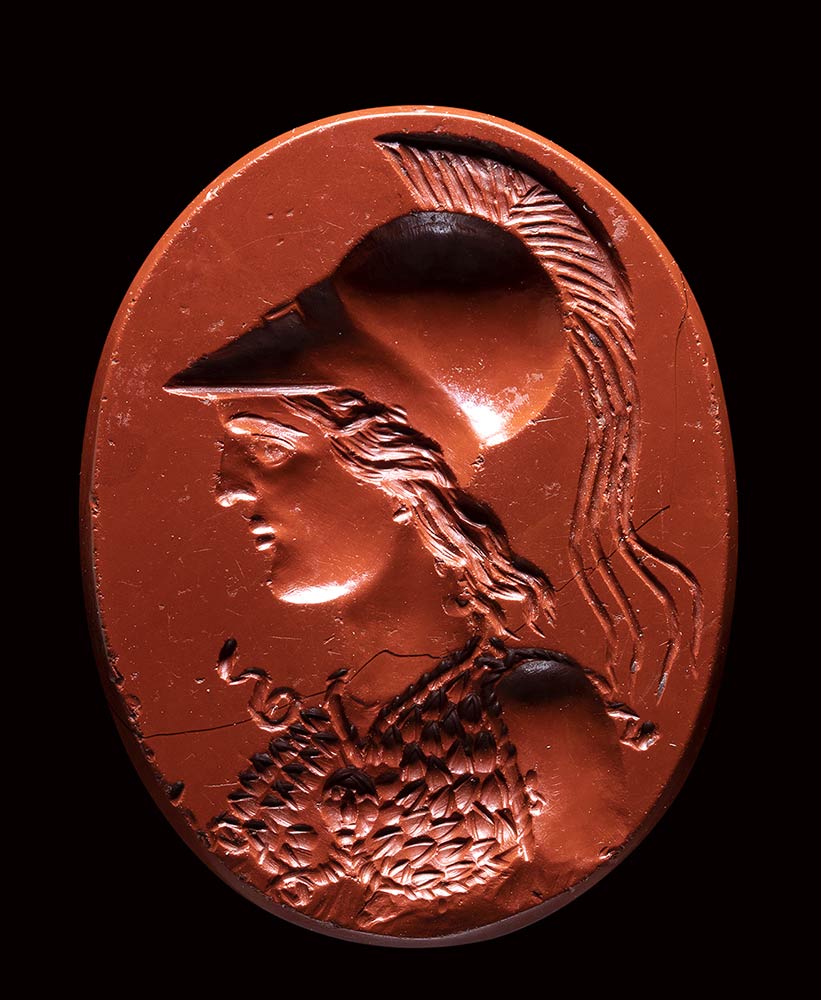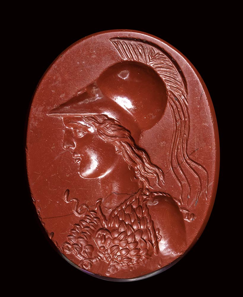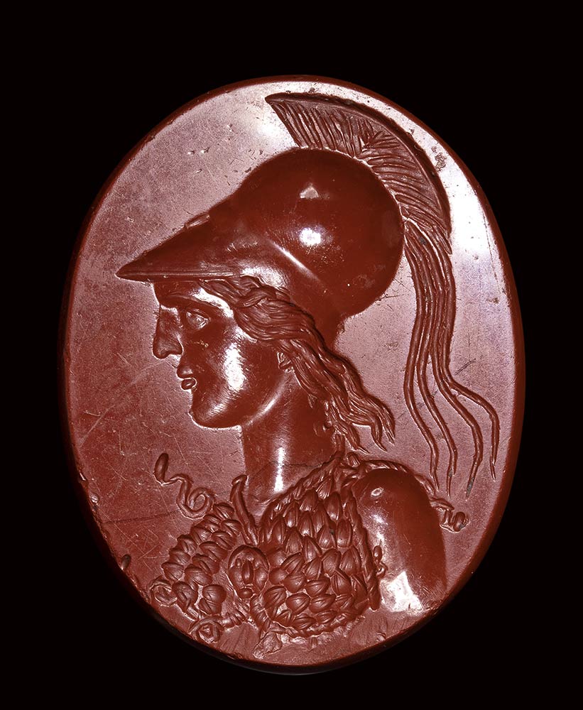 The deity is facing left. The head is helmeted while the bust is covered by the gorgoneion, with the mask of Medusa in the center, due to its apotropaic power and invincibility; small snakes rise from the mythical breastplate. The shoulder is naked. The hair falls elegantly on the neck, engraved with very thin and refined lines. Other details of the helmet (crest) and of the anatomy (eyes, browline) are also engraved with very fine lines. The work, of great artistic importance, is engraved on an extraordinarily large red jasper. The black line that runs horizontally through the stone is not a crack but a black inclusion (vein), typical of the jasper. The back of the gem shows engraved unfinished marks with the dry diamond point of an ornamental motif (vegetable or floral). This unfinished but just begun processing trace is an equally extraordinary testimony of to the greek engraving technique during the Hellenistic Era. Slight signs of wear and small chips on the edge.