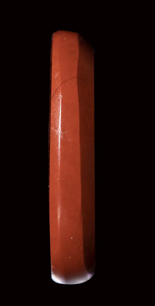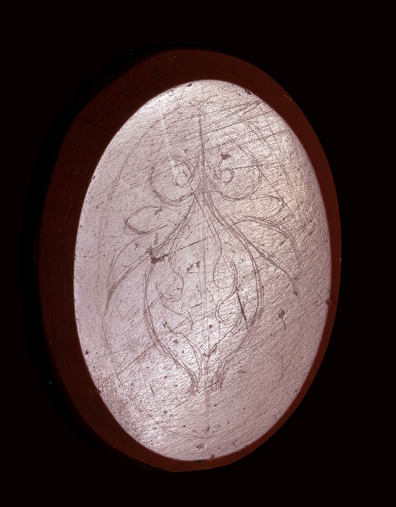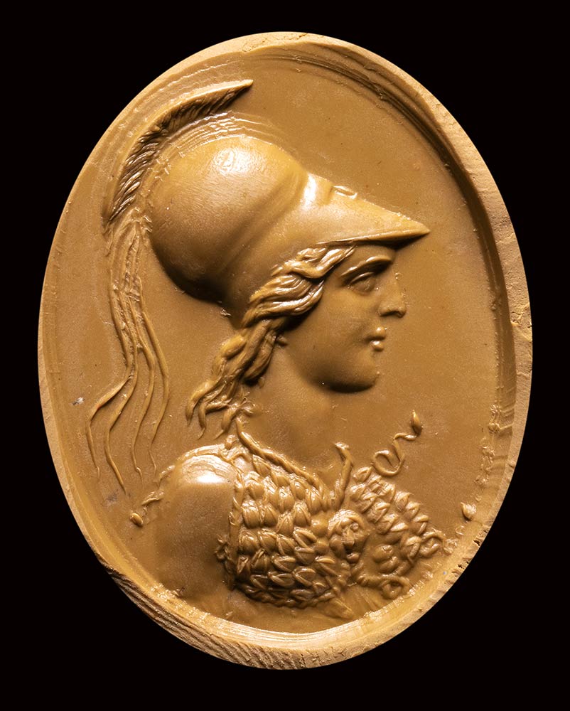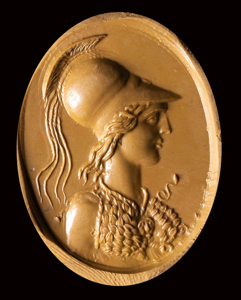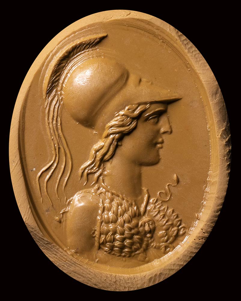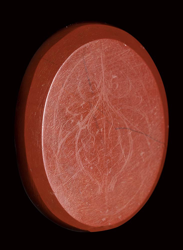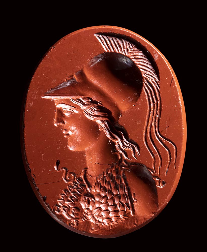 The deity is facing left. The head is helmeted while the bust is covered by the gorgoneion, with the mask of Medusa in the center, due to its apotropaic power and invincibility; small snakes rise from the mythical breastplate. The shoulder is naked. The hair falls elegantly on the neck, engraved with very thin and refined lines. Other details of the helmet (crest) and of the anatomy (eyes, browline) are also engraved with very fine lines. The work, of great artistic importance, is engraved on an extraordinarily large red jasper. The black line that runs horizontally through the stone is not a crack but a black inclusion (vein), typical of the jasper. The back of the gem shows engraved unfinished marks with the dry diamond point of an ornamental motif (vegetable or floral). This unfinished but just begun processing trace is an equally extraordinary testimony of to the greek engraving technique during the Hellenistic Era. Slight signs of wear and small chips on the edge.
