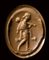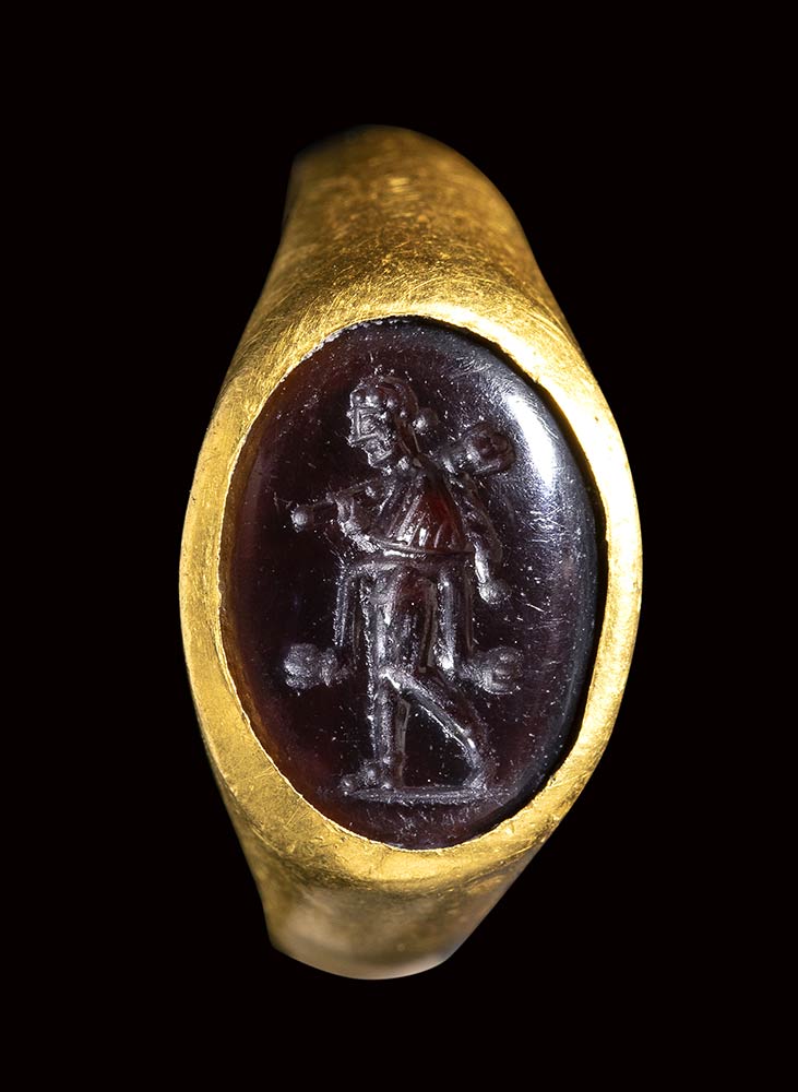 This plain rounded hoop, flatten within and extending outbroad on the shoulders with a ridge. The oval box setting contains a garnet intaglio with engraved scene depicting Omphale walking left with a club on his right shoulders. Groundline.Wear marks.