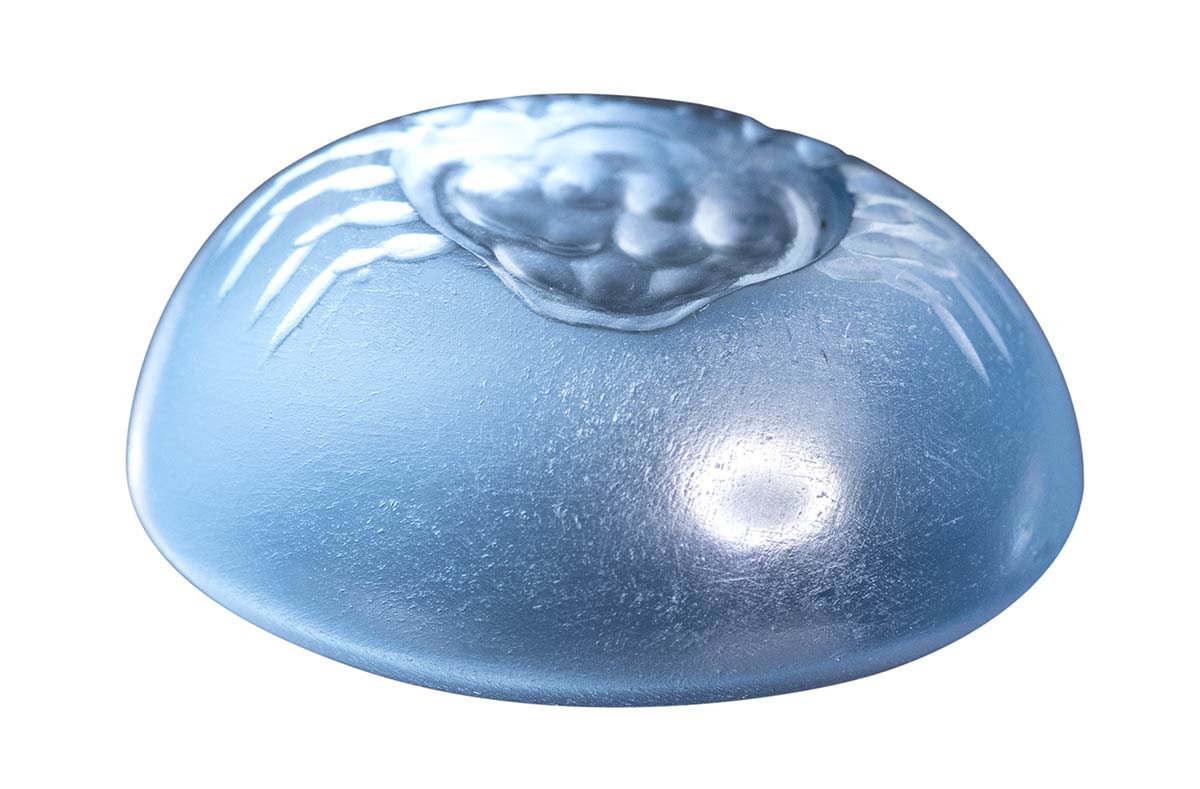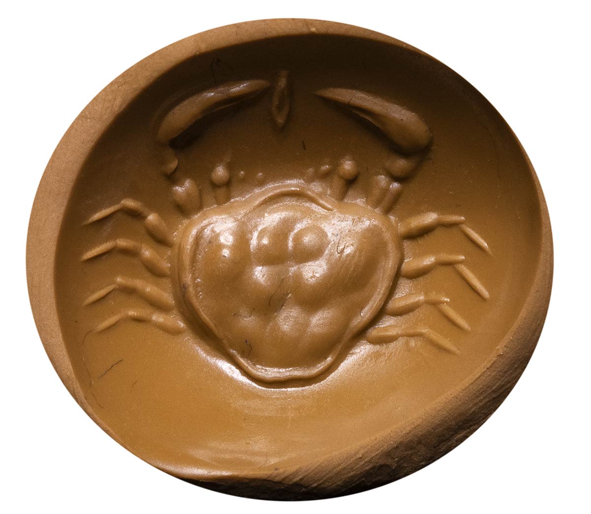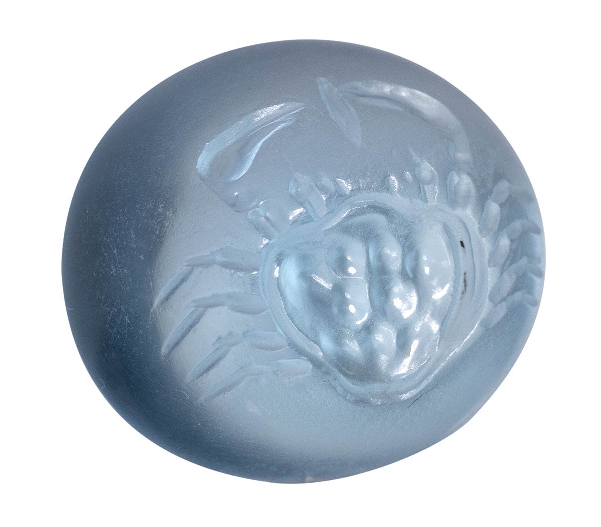 The crustacean is seen from above. The crab holds a shell (mussel?) between its claws. Every anatomical detail is rendered with great skill and naturalism. Popular and frequent subject in classical glyptic production; the reference model is identifiable to the late classical Greek art. The animal is deeply engraved in an extraordinary beryl, characterized by an intense and luminous color, thanks to the very convex surface. The shape of thr stone is more typical of the early hellenistic period. Wear marks on the surface. Mirror polishing inside the intaglio. Of great rarity. Parallel: See greek coinage: Sicily, Akragas, silver Didrachm (circa 490-470 BC); Akragas, Sicily. Circa 414-413 BC. AR Tetradrachm.