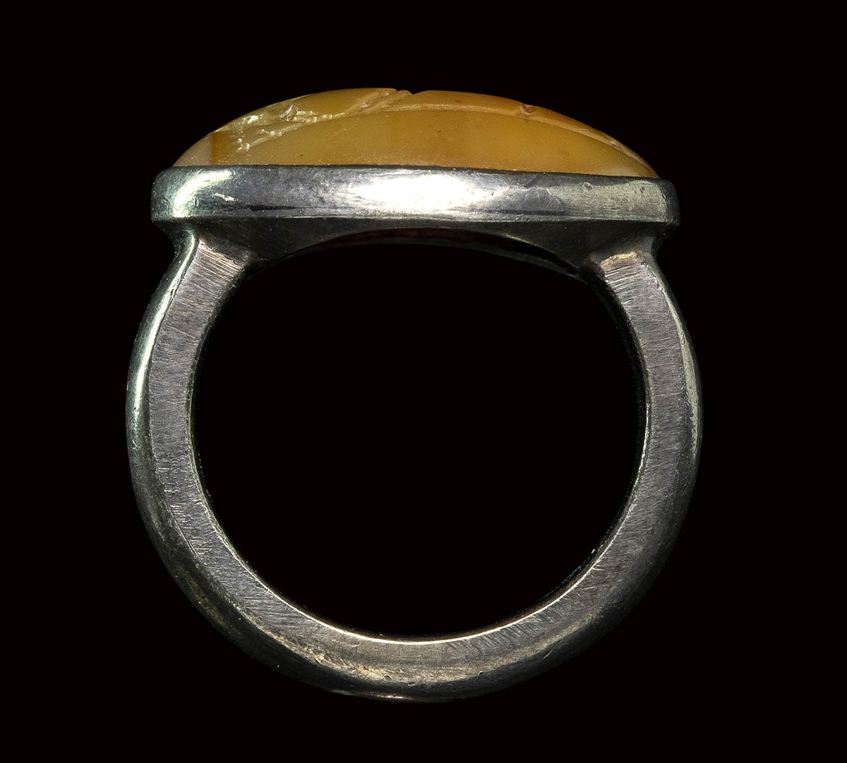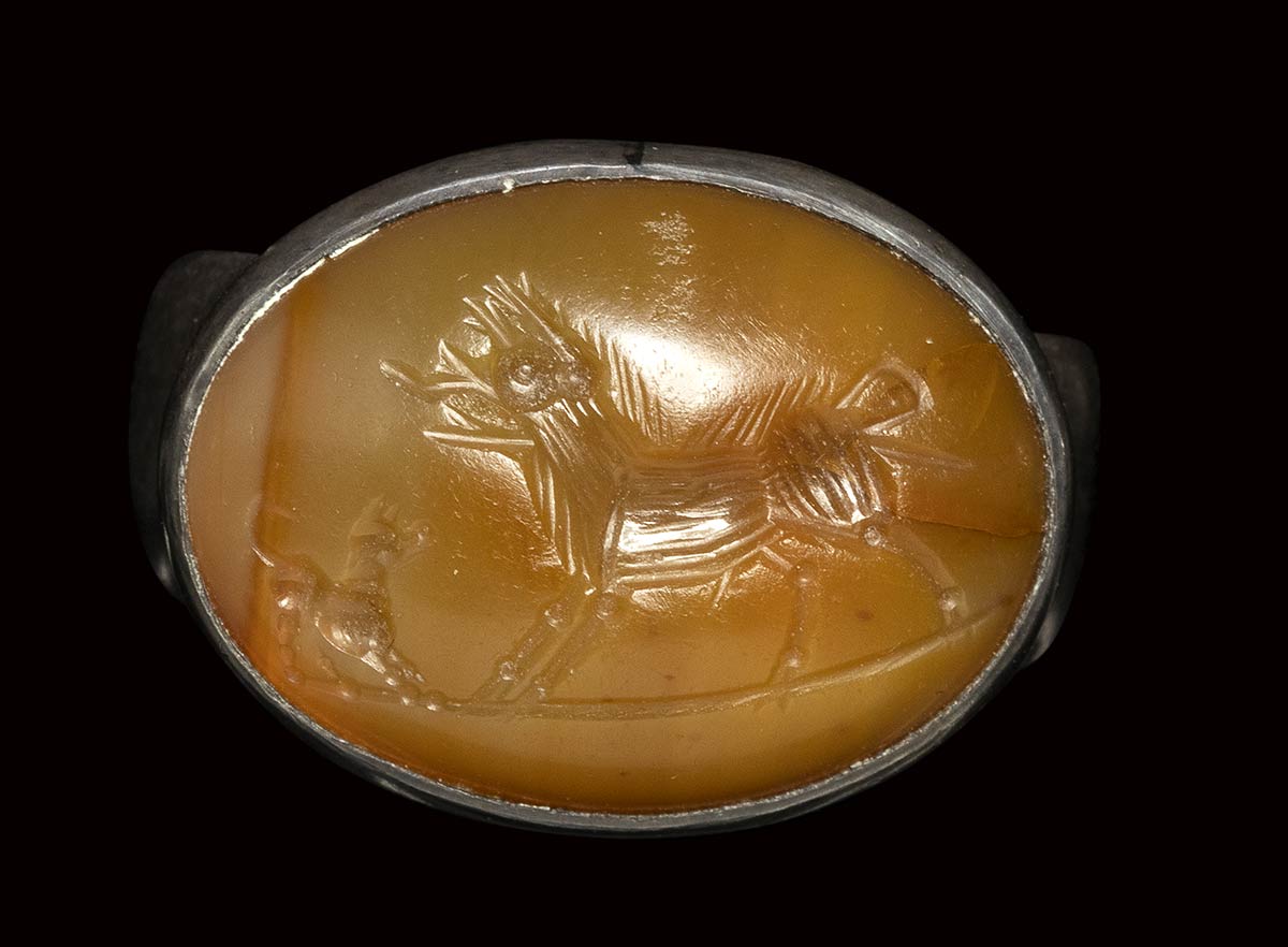 A roman italic agate intaglio set in a silver ring. Boar with a dog.