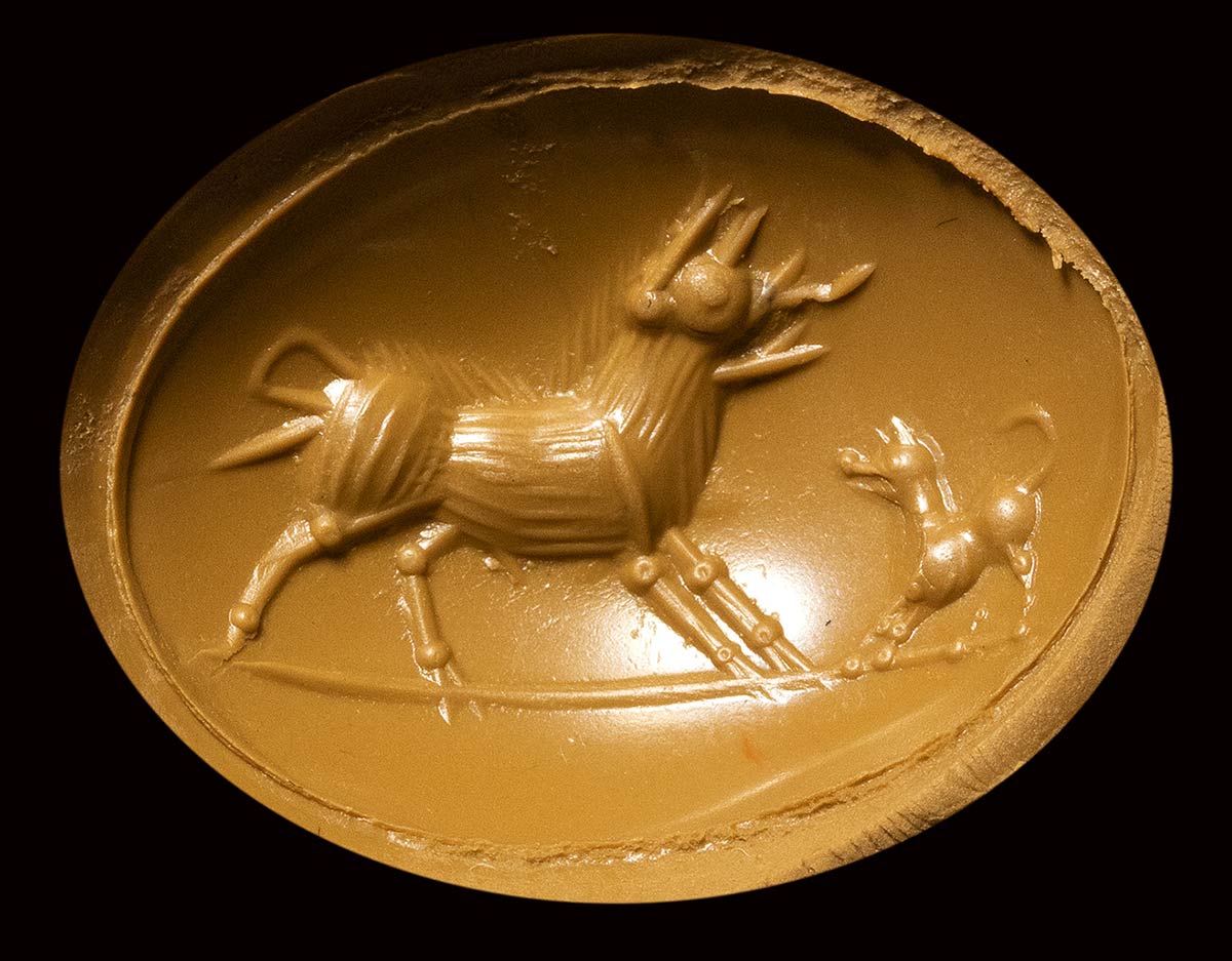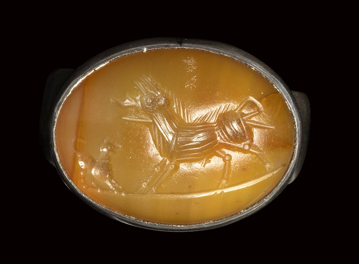 On the left, a small dog is facing a large boar, which is on the right. Groundline. Presence of globular elements. Large convex gem, mounted on a post-classical ring with french marks.